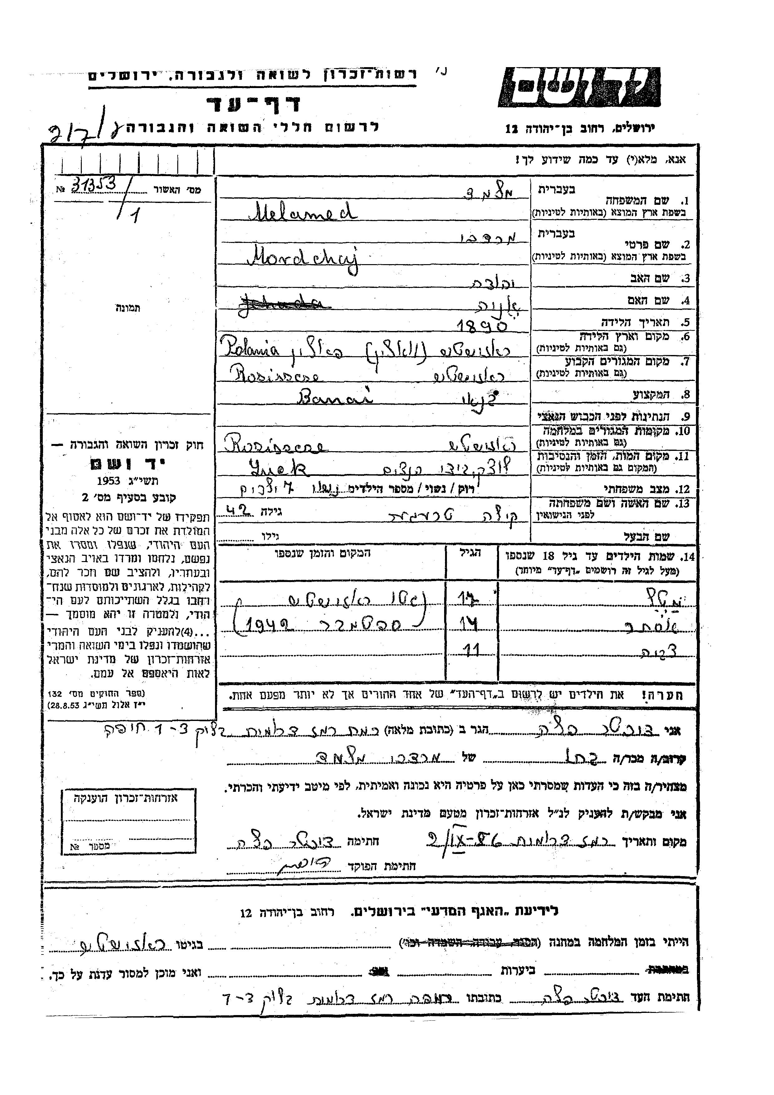 Tzvia Melamed wurde Er/sie war der/ die Sohn/Tochter von Mordchaj und Keila, geb. Treger. Er/Sie war Kind. Vor dem Zweiten Weltkrieg er/sie in Rozyszcze, Polen. Während des Krieges war er/sie in Rozyszcze, Polen.