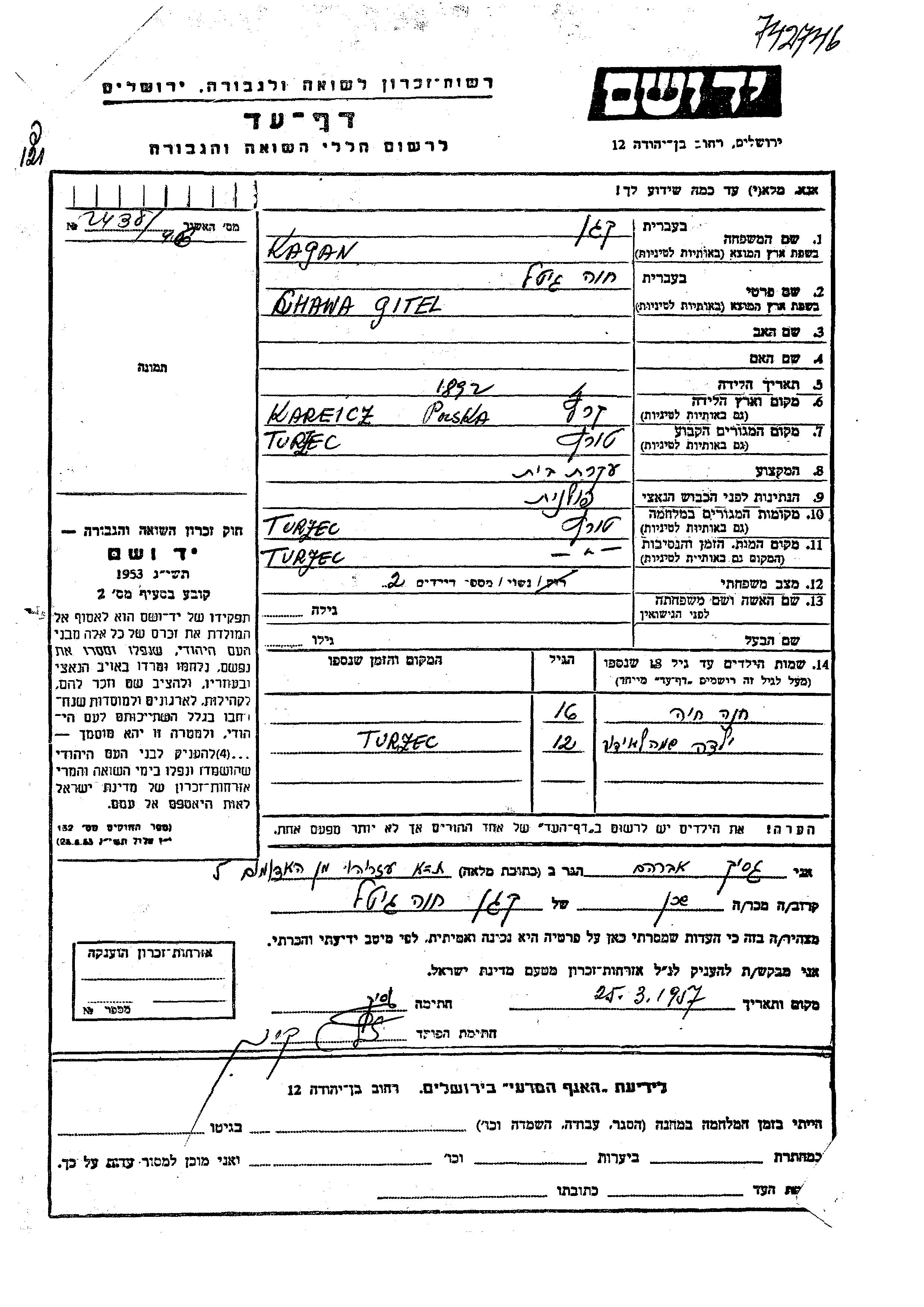 Kagan Vorname unbekannt Turzec, Polen Gedenkblatt