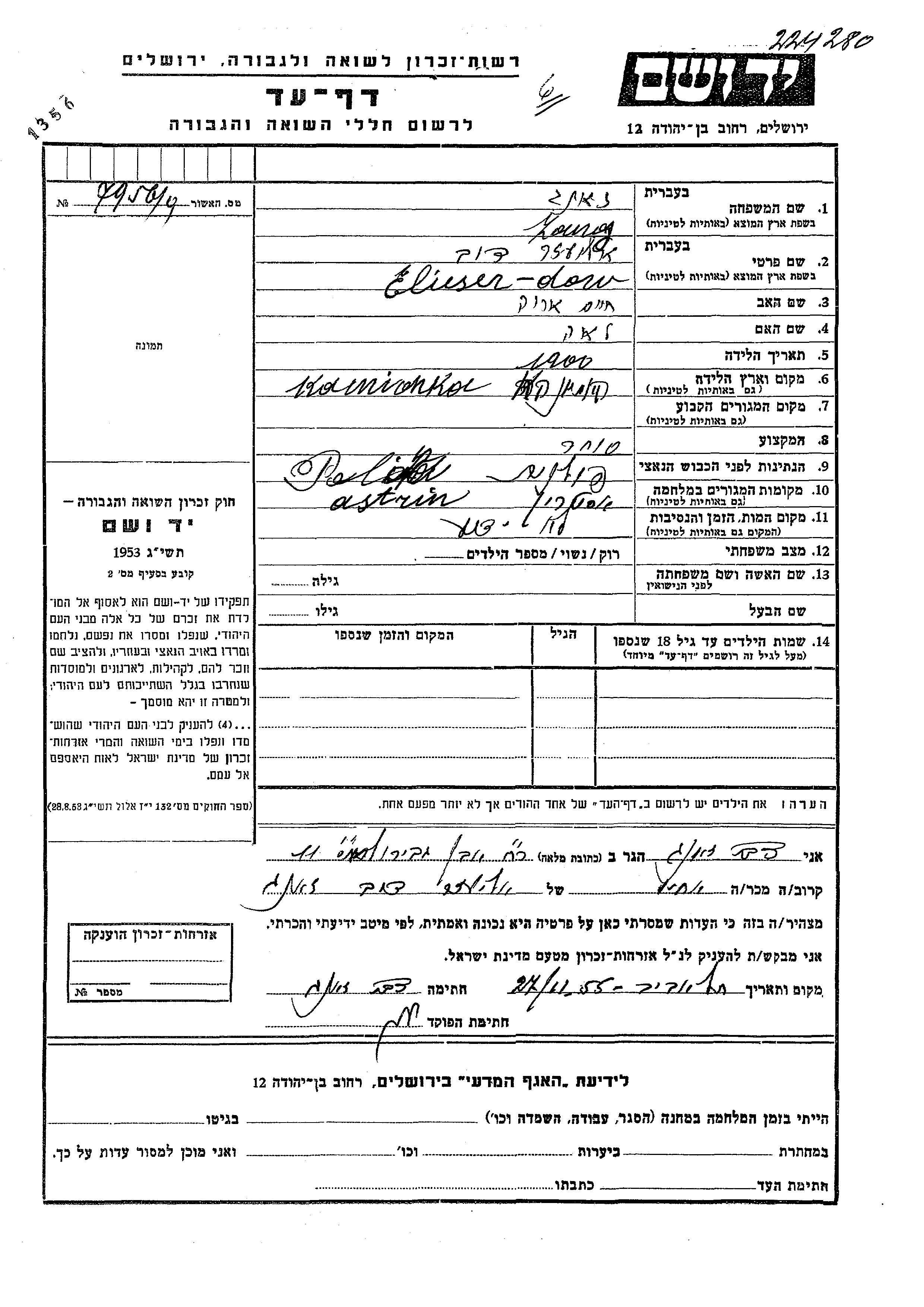 Elieser Dow Tzank Zang wurde im Jahr 1900 in Kamionka, Polen geboren. Er war der Sohn von Khaim Arie und Lea. Er war Kaufmann/-frau. Während des Krieges war er in Ostryn, Polen.