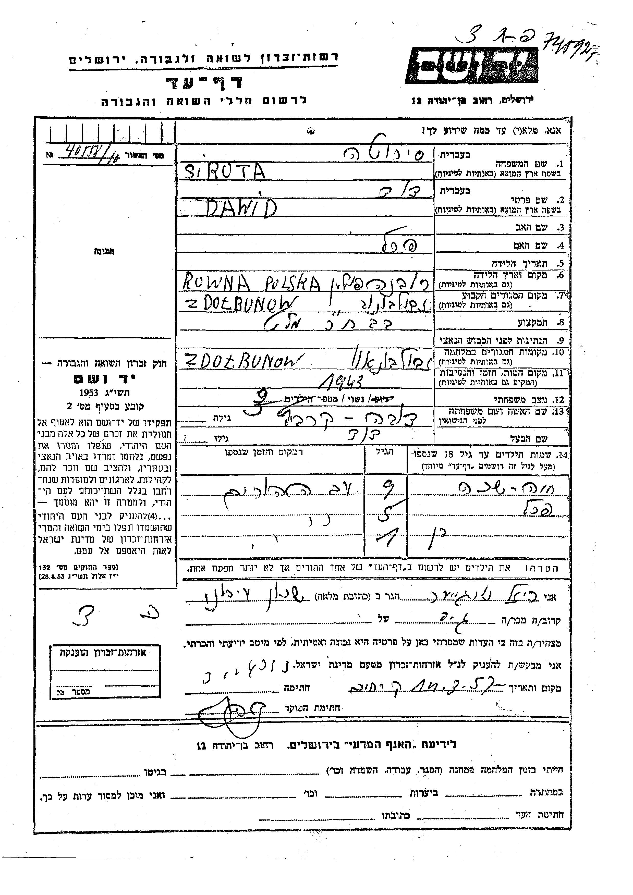 Vorname unbekannt Sirota wurde Er/sie war der/ die Sohn/Tochter von Dawid und Doba, geb. Kravitz. Er/Sie war Kind. Vor dem Zweiten Weltkrieg er/sie in Zdolbunow, Polen. Während des Krieges war er/sie in Zdolbunow, Polen.