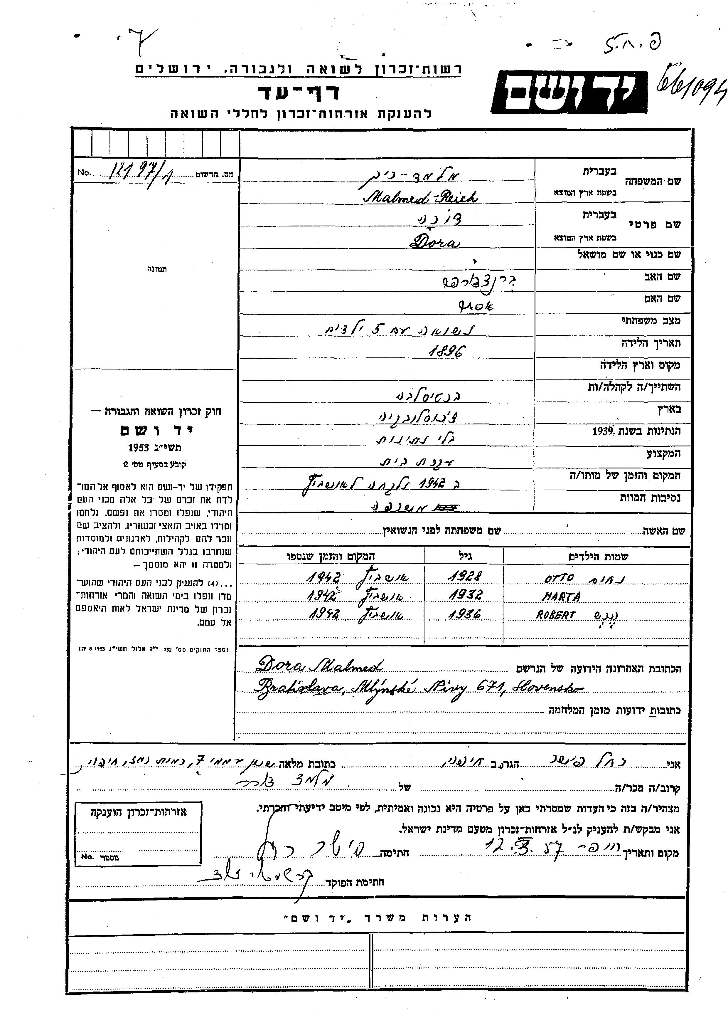 Otto Nakhum Malmed Ruch Rokh wurde im Jahr 1928 geboren. Er war der Sohn von Dora. Er war Kind. Vor dem Zweiten Weltkrieg lebte er in Bratislava, Tschechoslowakei. Während des Krieges war er in Bratislava, Tschechoslowakei.