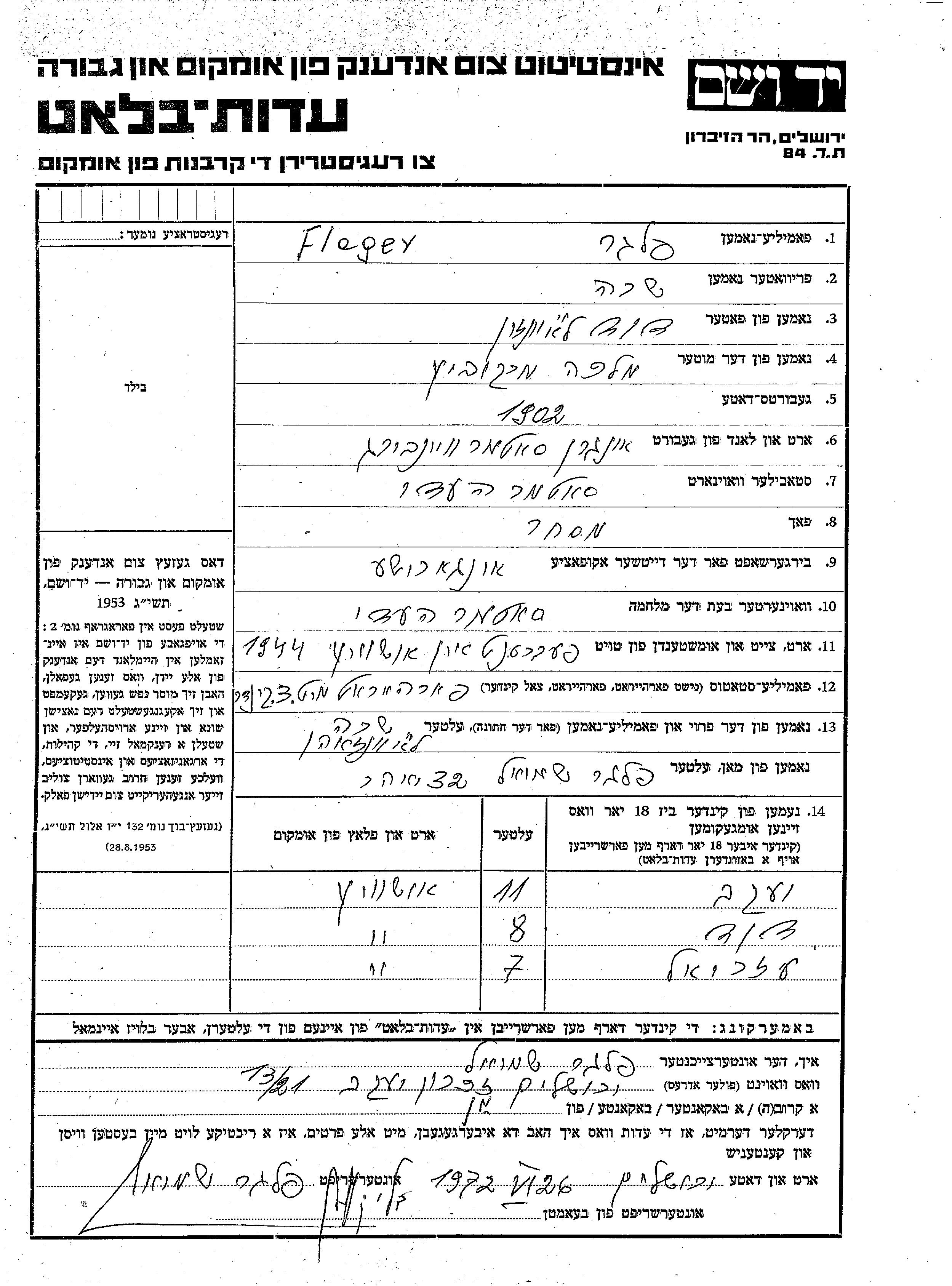 Yaakov Fleger wurde Er war der Sohn von Shmuel und Sara, geb. Levinson. Er war Kind. Vor dem Zweiten Weltkrieg lebte er in Ungarn. Während des Krieges war er in Satmar, Rumänien.