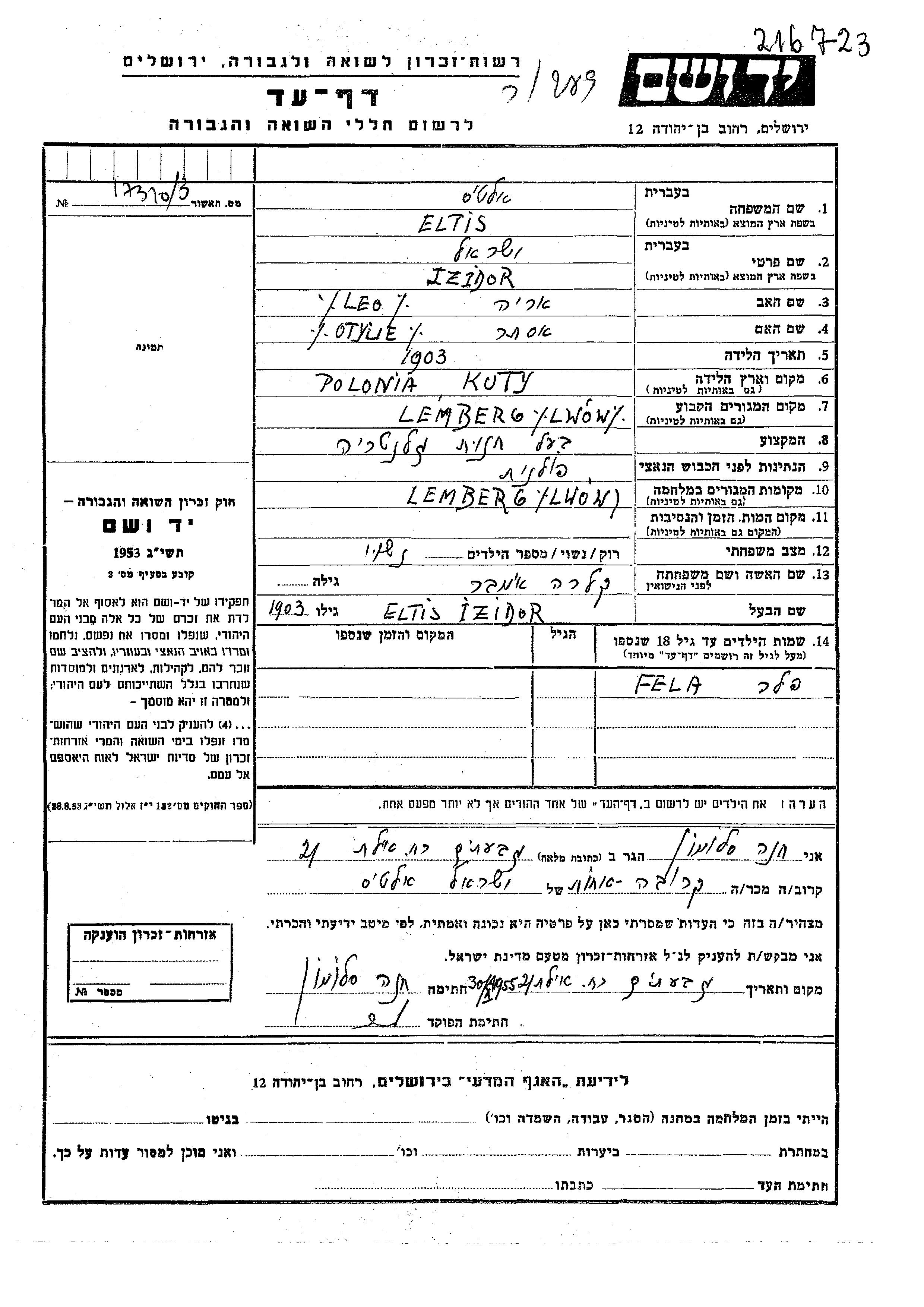 Fela Eltis wurde Sie war die Tochter von Izidor Yisrael und Klara, geb. Imber. Sie war Kind. Vor dem Zweiten Weltkrieg lebte sie in Lemberg, Polen. Während des Krieges war sie in Lemberg, Polen.