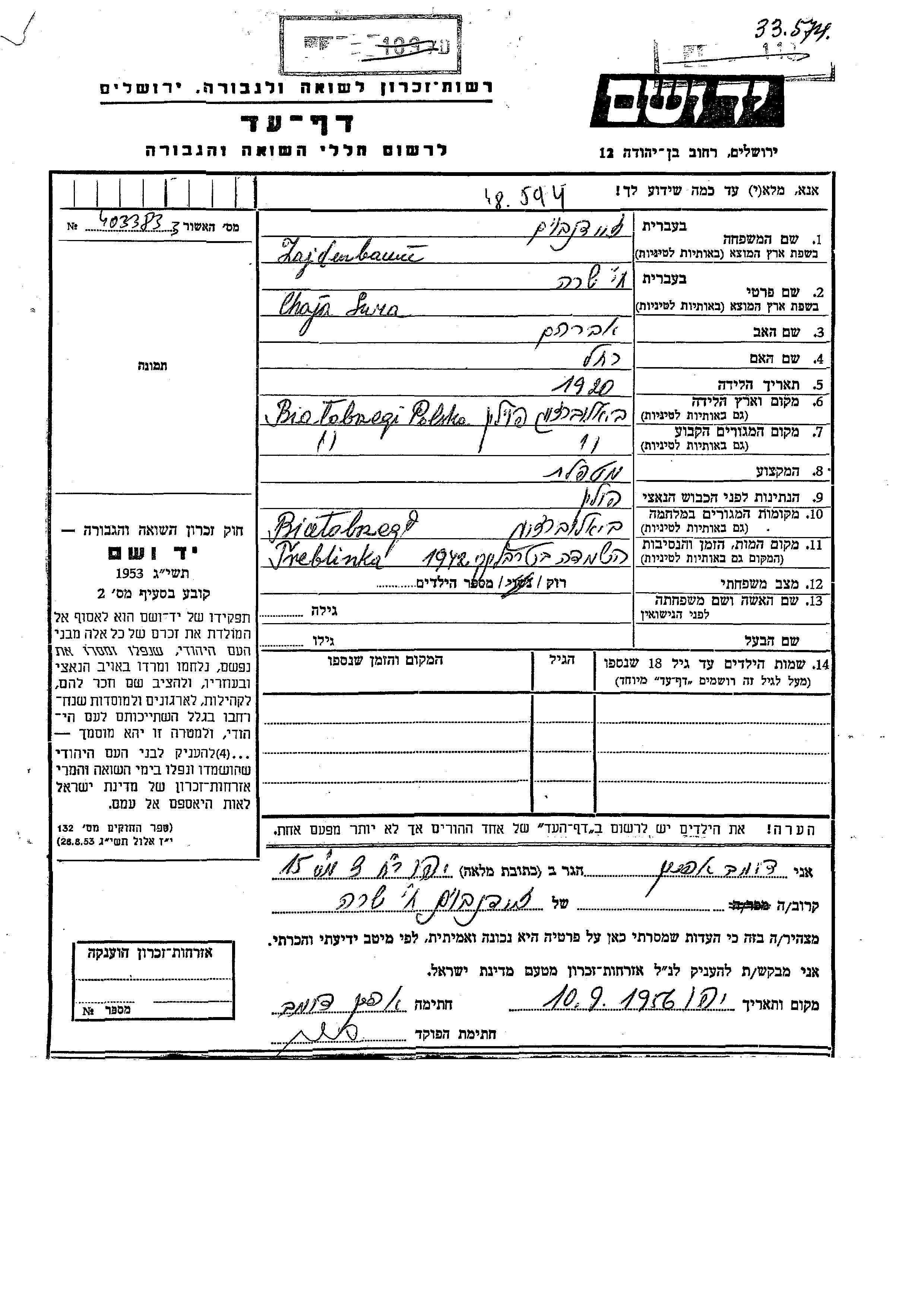 Chaja Sura Zajdenbaum wurde im Jahr 1920 in Bialobrzegi, Polen geboren. Sie war die Tochter von Avraham und Rakhel. Sie war Kinderbetreuerin und Ledig. Vor dem Zweiten Weltkrieg lebte sie in Bialobrzegi, Polen. Während des Krieges war sie in Bialobrzegi, Polen.