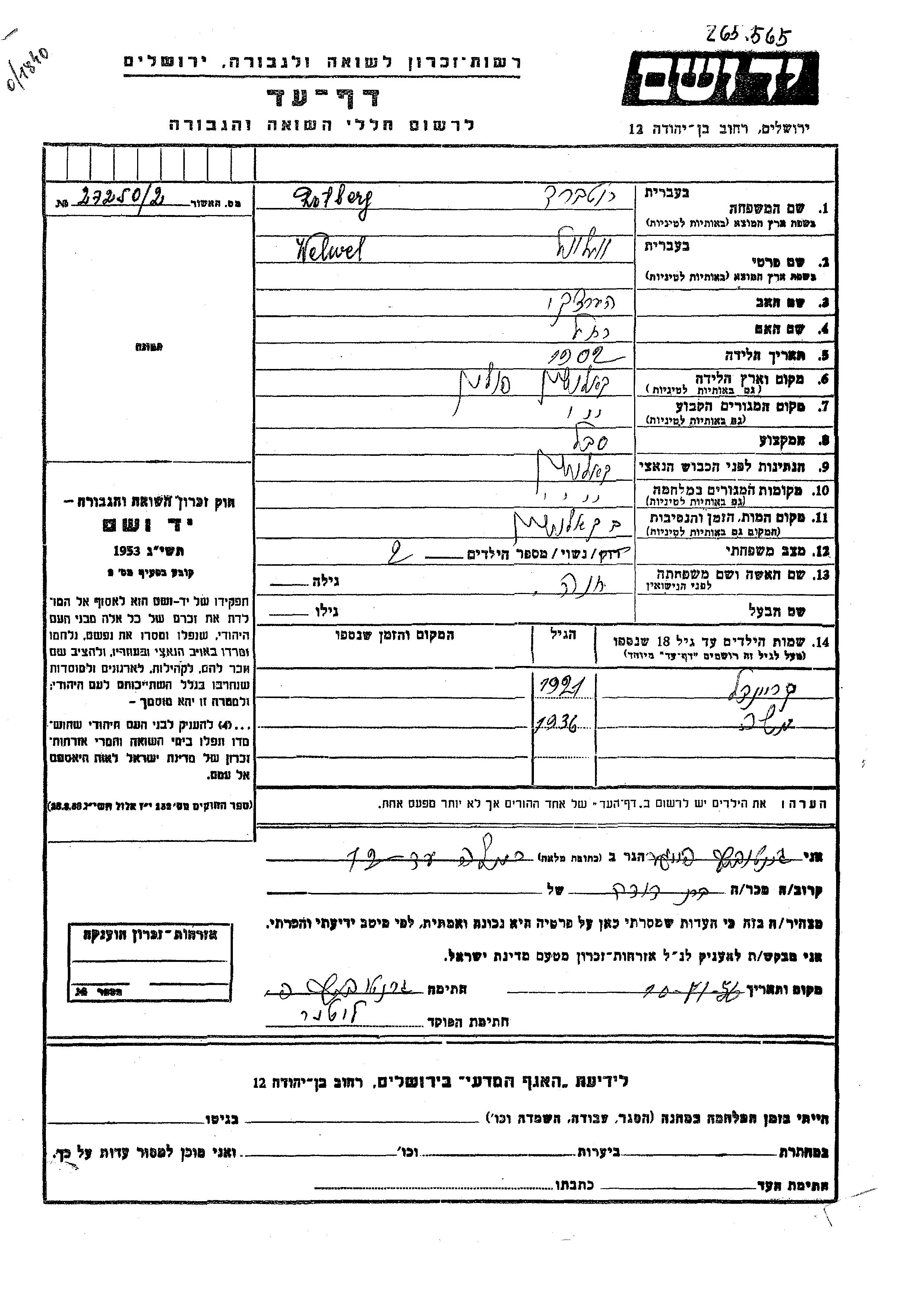 Moshe Rotberg wurde im Jahr 1936 geboren. Er war der Sohn von Welwel und Khana. Er war Kind.