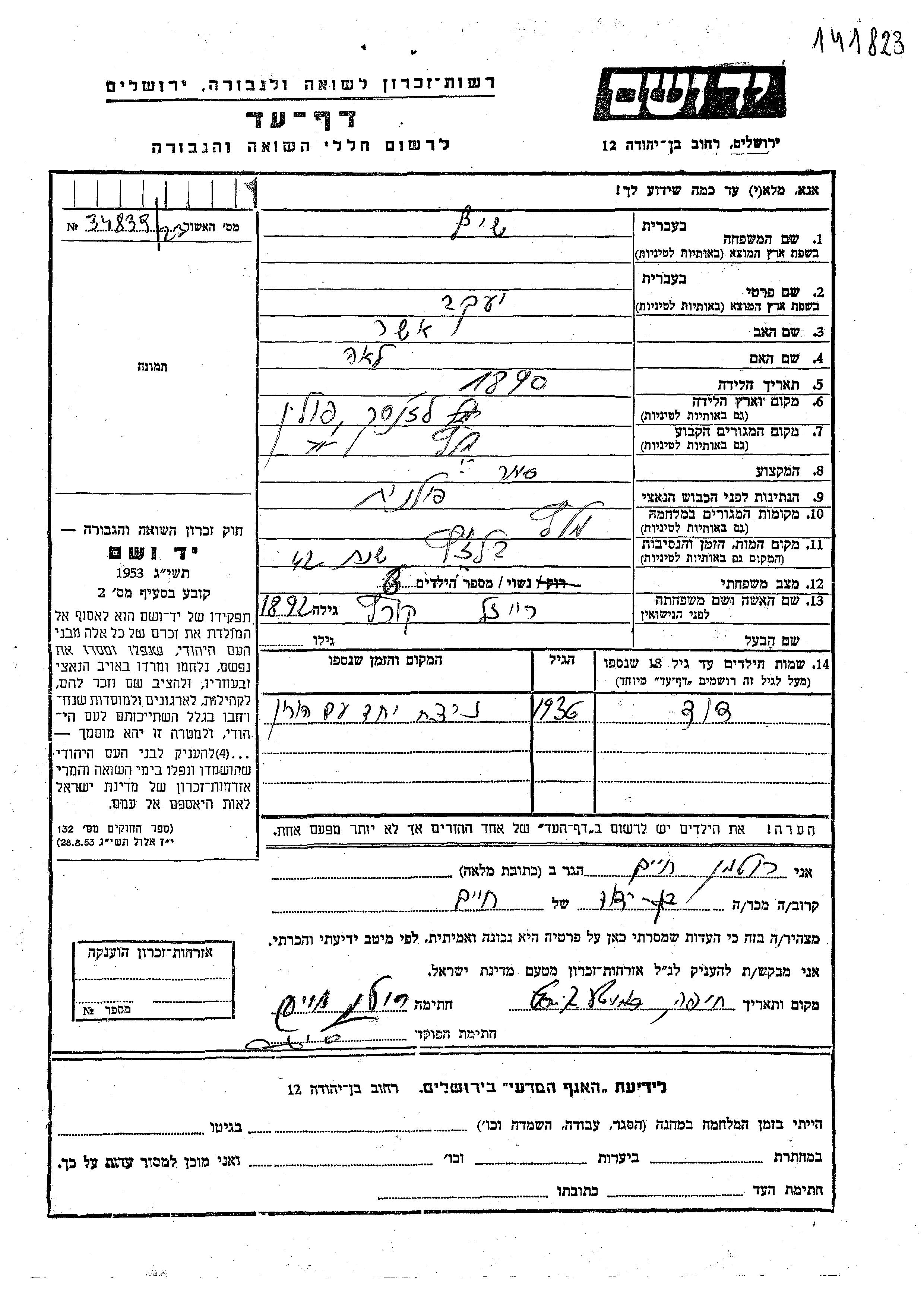David Shif Yaakov Reizl девичья фамилия Kurtz. Kind. Место жительства до войны: Melec, Polen. Место во время войны: Melec, Polen.