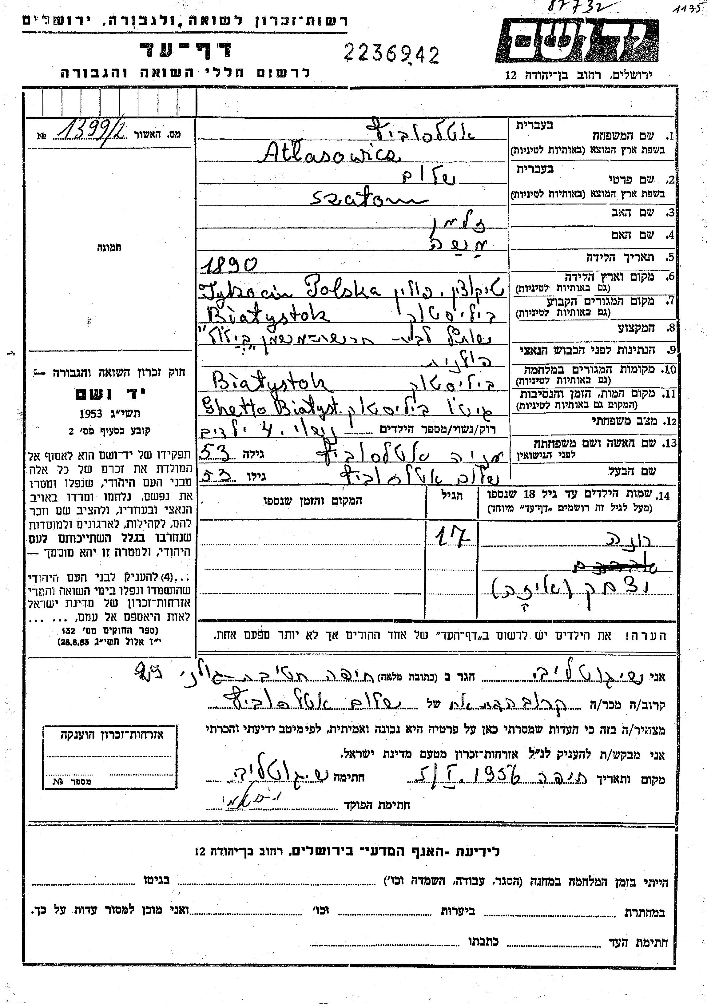 Atlasowicz Yitzkhak Izabela Bialystok, Polen Gedenkblatt
