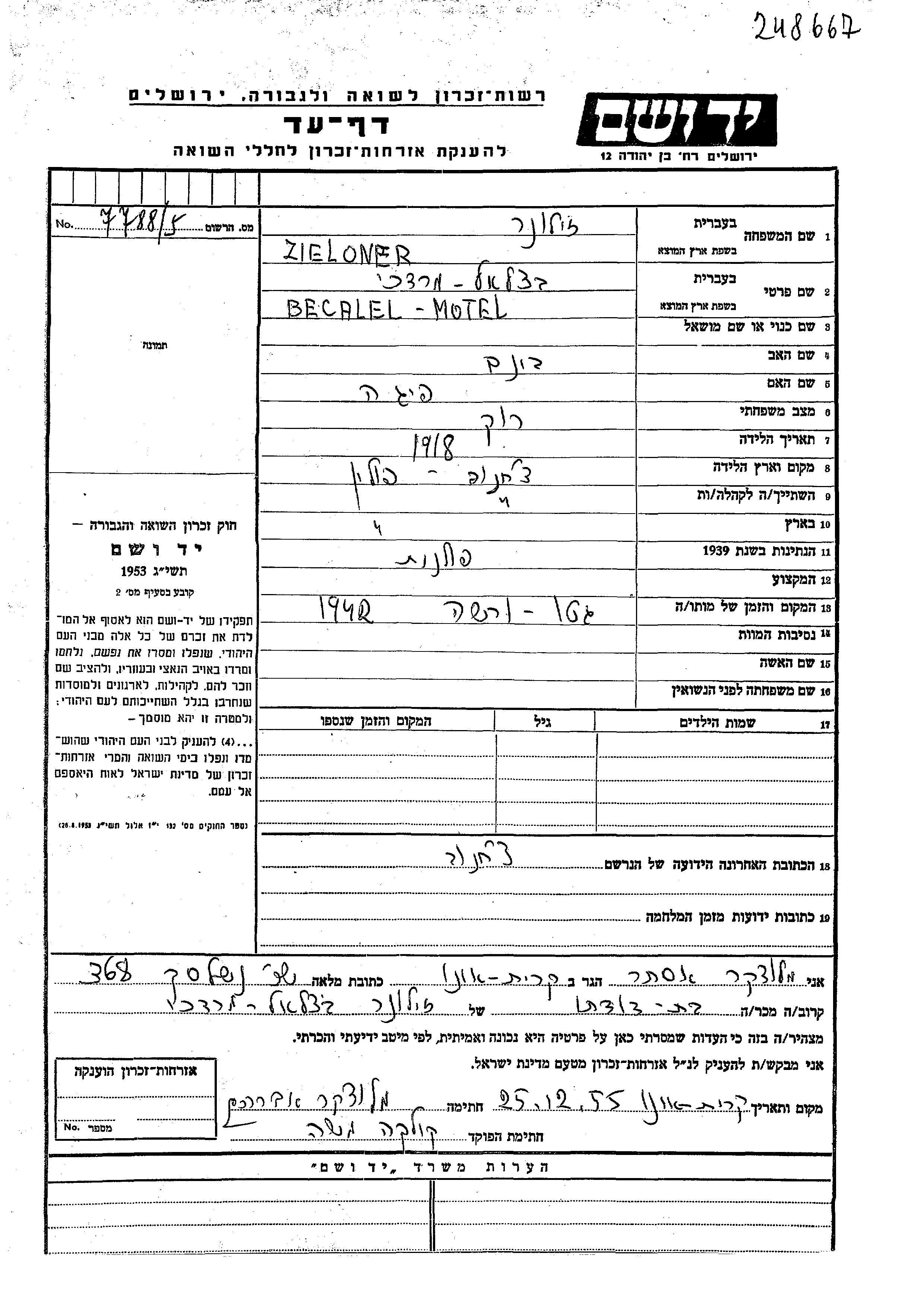 Becalel Motel Zieloner wurde im Jahr 1918 in Chechinov, Polen geboren. Er war der Sohn von Binem und Feiga. Er war Ledig. Vor dem Zweiten Weltkrieg lebte er in Chechinov, Polen. Während des Krieges war er in Chechinov, Polen.