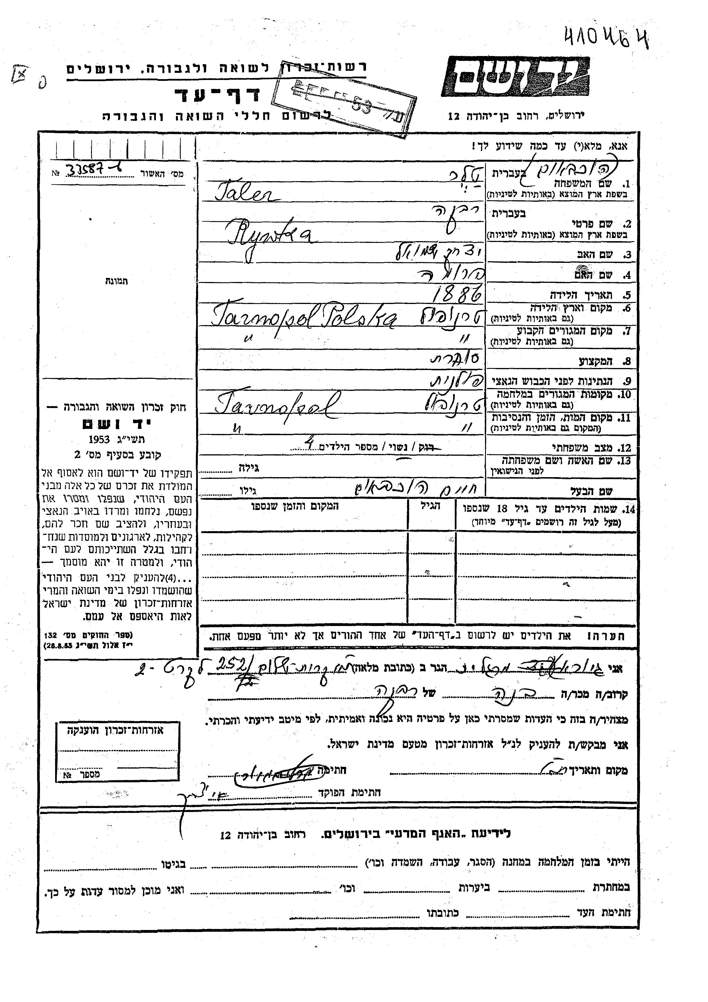 Rywka Taler, geb. Hokhbaum wurde im Jahr 1886 in Tarnopol, Polen geboren. Sie war die Tochter von Yitzkhak Shmuel und Fruma. Sie war Kaufmann/-frau und mit Khaim Verheiratet. Vor dem Zweiten Weltkrieg lebte sie in Tarnopol, Polen. Während des Krieges war sie in Tarnopol, Polen.