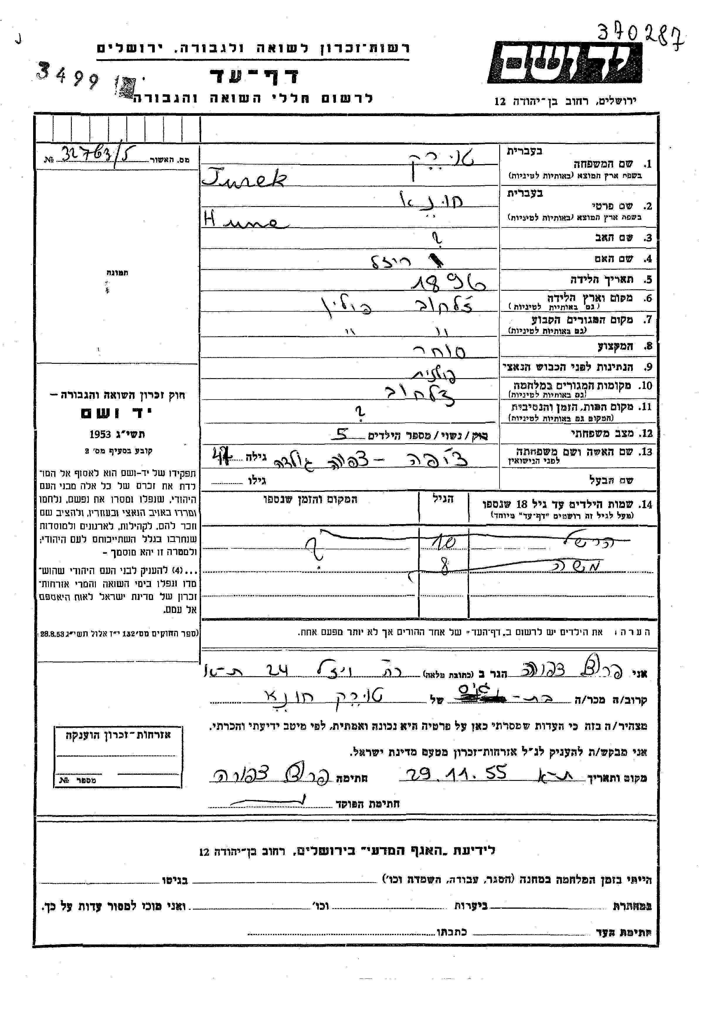 Moshe Turek wurde Er war der Sohn von Huna und Tzipora Golda. Er war Kind. Vor dem Zweiten Weltkrieg lebte er in Zelechow, Polen. Während des Krieges war er in Zelechow, Polen.