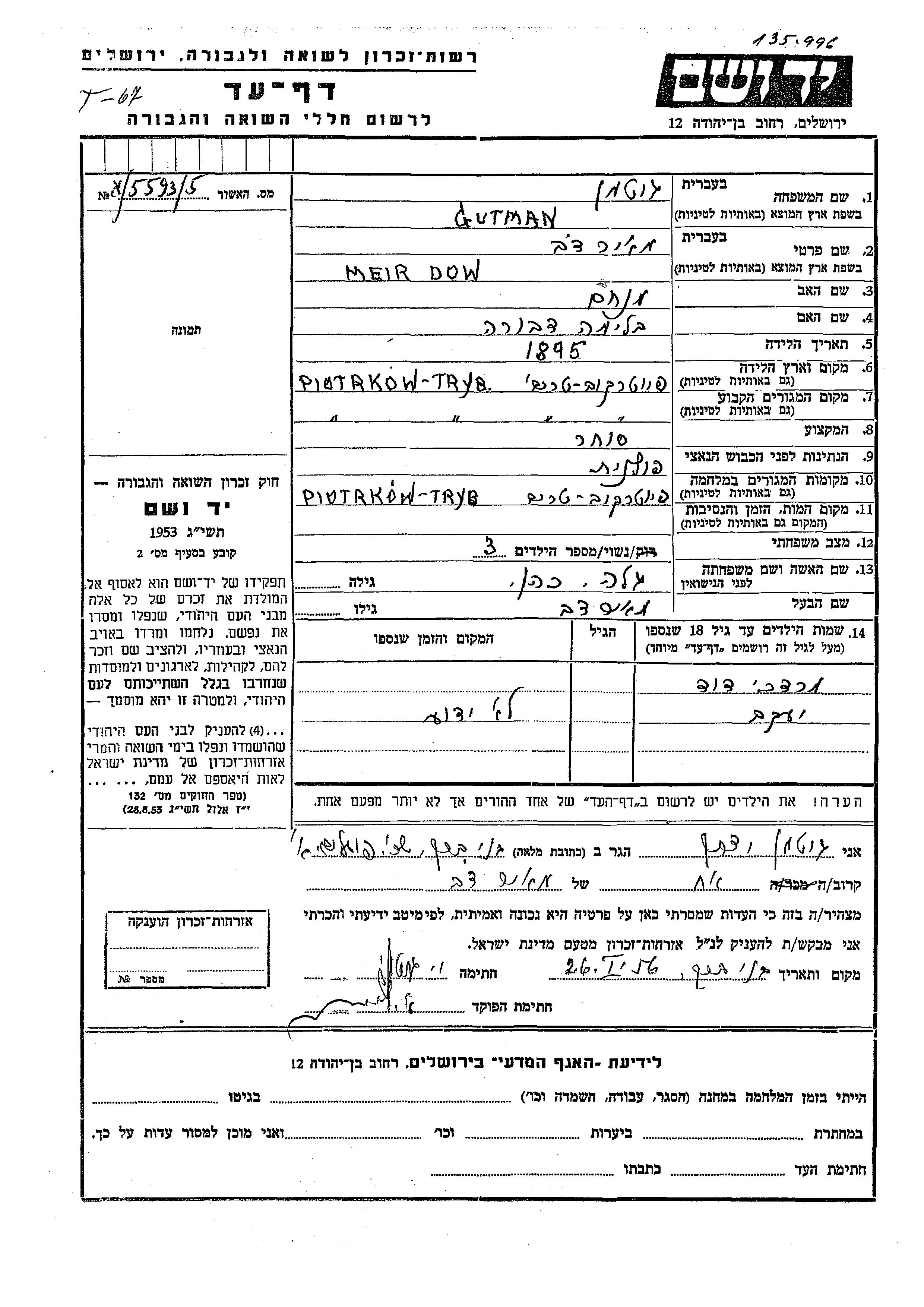 Mordekhai David Gutman wurde Er war der Sohn von Dow Meir und Gela, geb. Kohen. Er war Kind. Vor dem Zweiten Weltkrieg lebte er in Piotrkow Trybunalski, Polen. Während des Krieges war er in Piotrkow Trib., Massaker Ort.