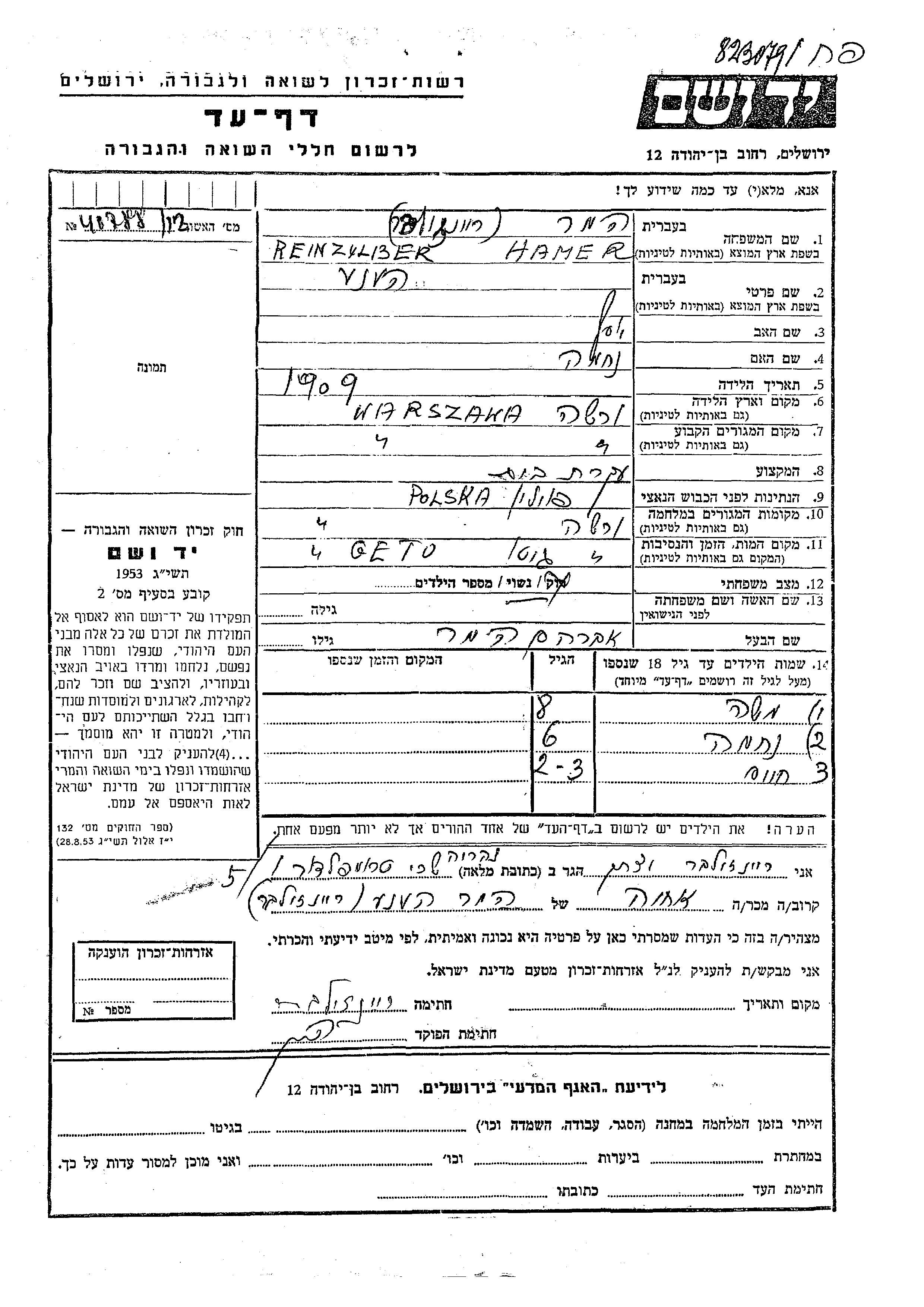 Khaim Hamer wurde Er war der Sohn von Avraham und Hene, geb. Reinzylber. Er war Kind. Vor dem Zweiten Weltkrieg lebte er in Warsaw, Polen. Während des Krieges war er in Warsaw, Polen.