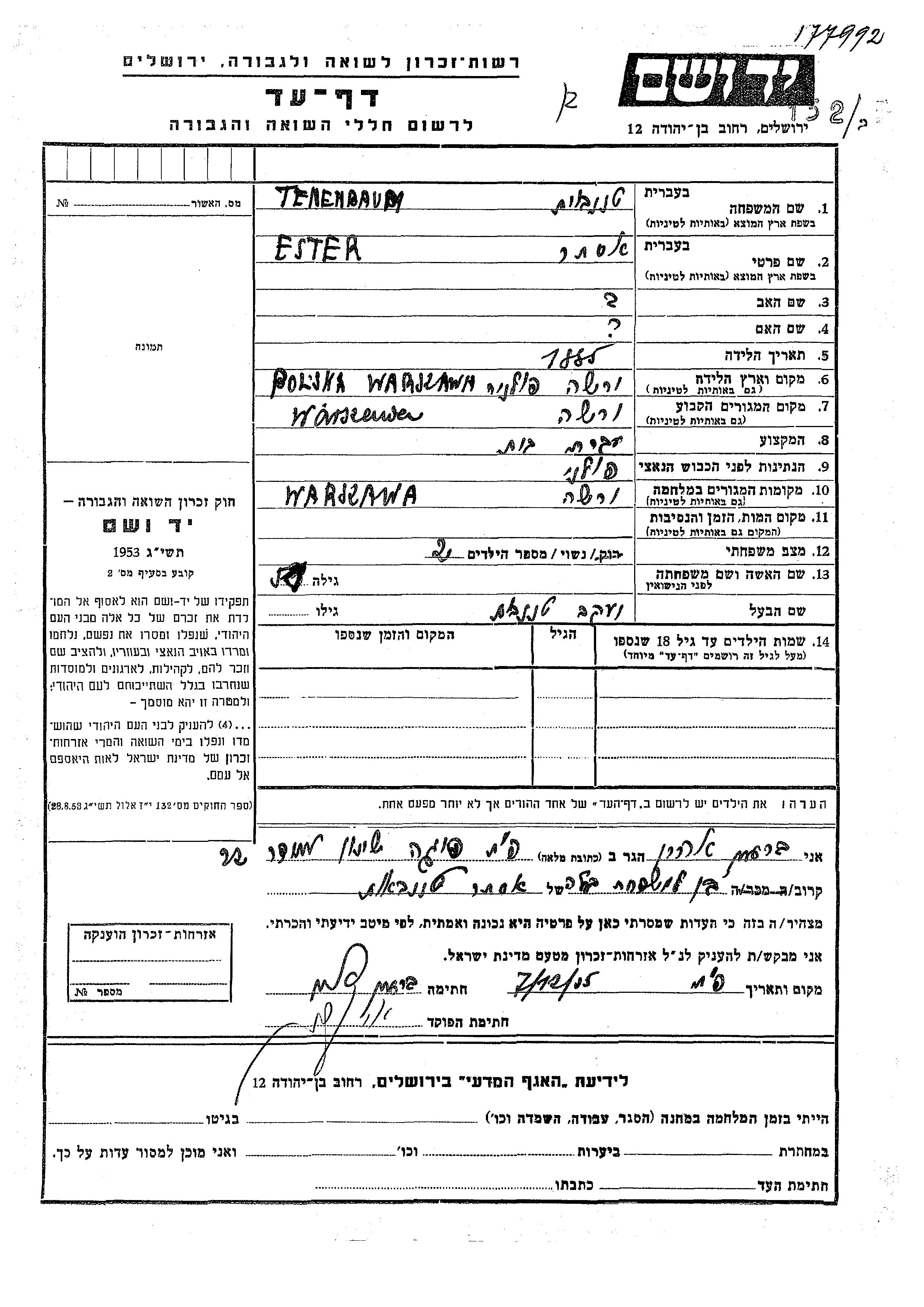 Ester Tenenbaum wurde im Jahr 1885 in Warsaw, Polen geboren. Sie war Hausfrau und mit Yaakov Verheiratet. Vor dem Zweiten Weltkrieg lebte sie in Warsaw, Polen. Während des Krieges war sie in Warsaw, Polen.
