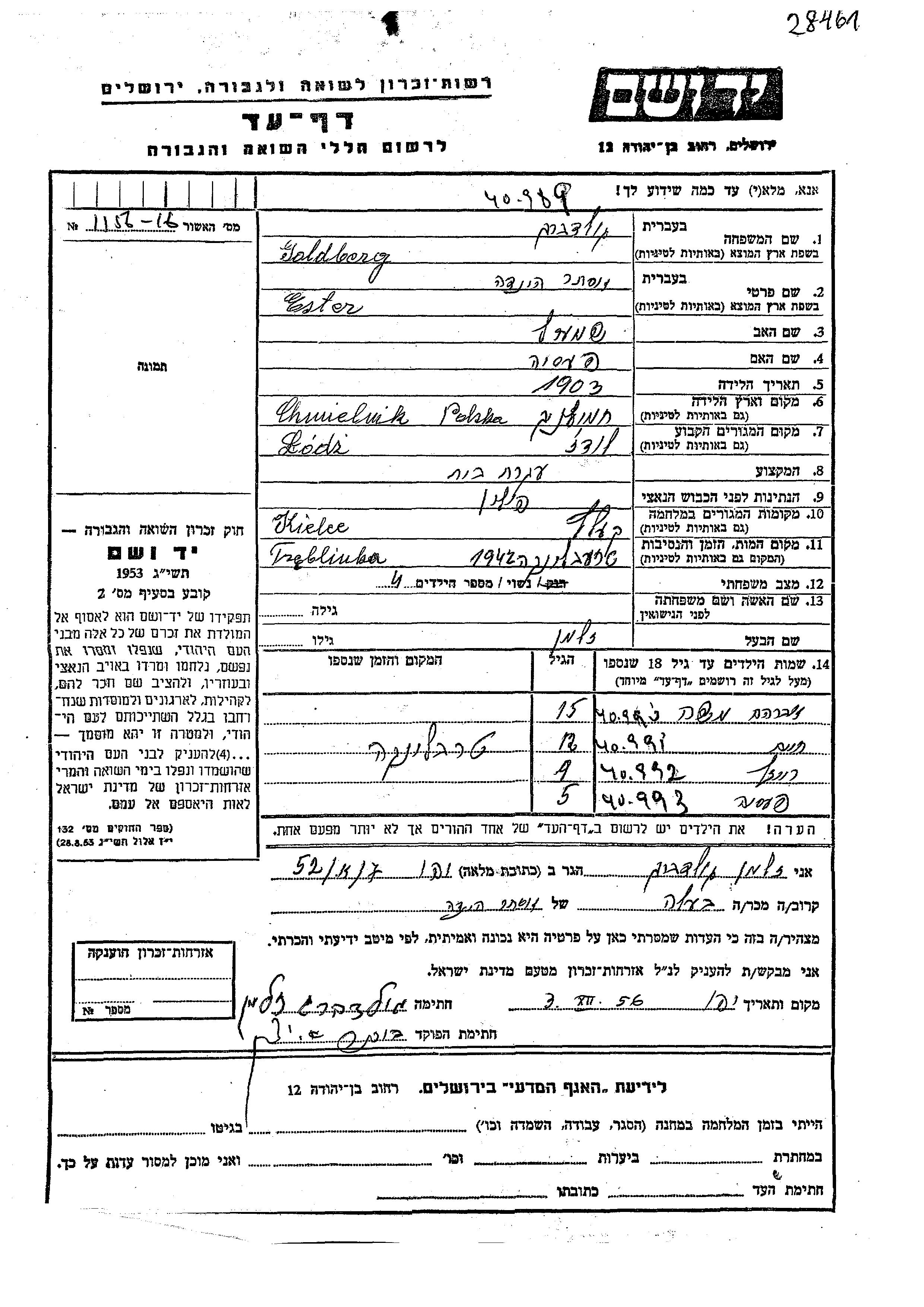 Pesia Goldberg wurde Sie war die Tochter von Zalman und Ester Hinda. Sie war Kind. Vor dem Zweiten Weltkrieg lebte sie in Lodz, Polen. Während des Krieges war sie in Kielce, Polen.