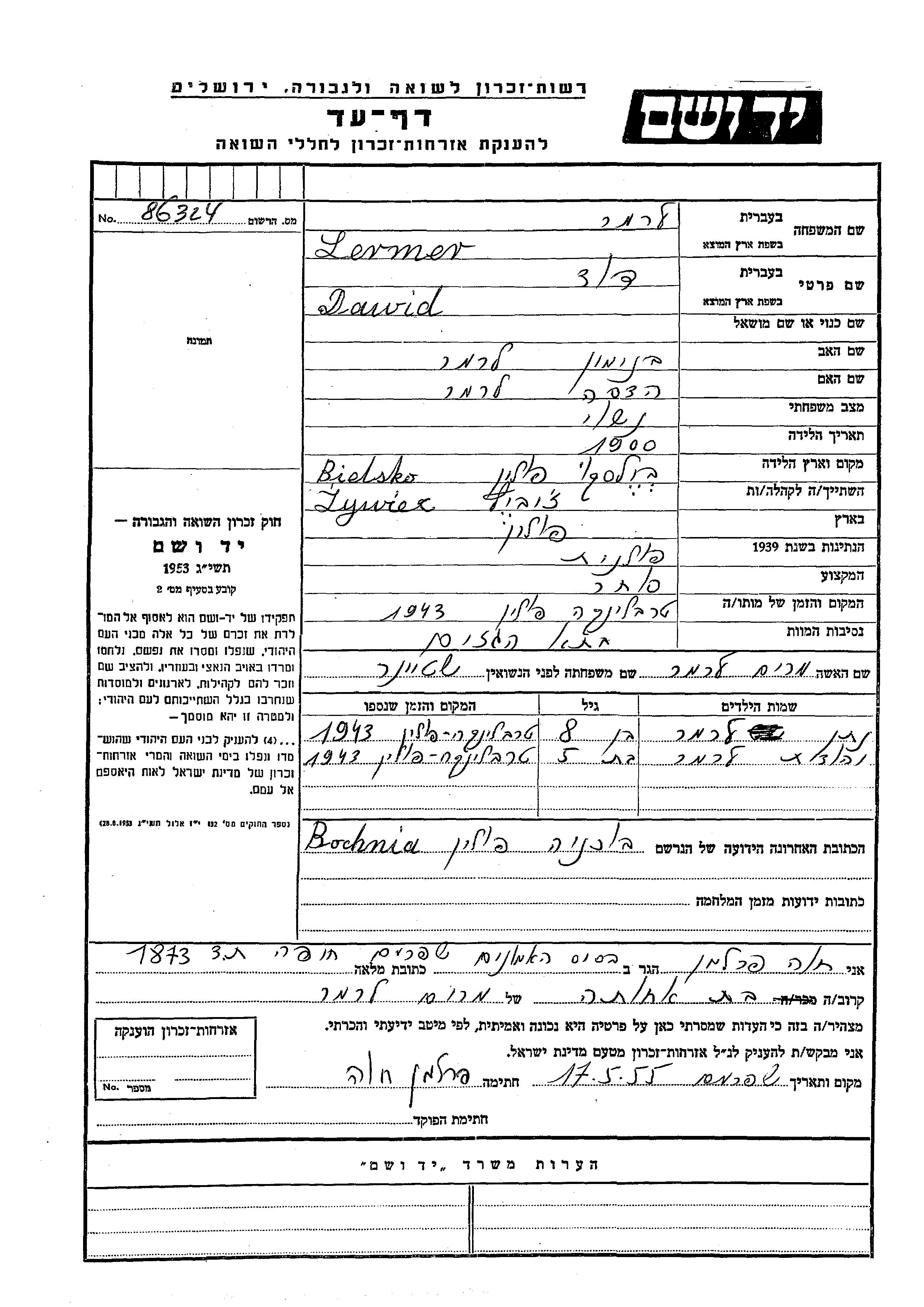 Yehudit Lermer wurde Sie war die Tochter von Dawid und Miriam, geb. Shteiner. Sie war Kind. Während des Krieges war sie in Bochnia, Polen.