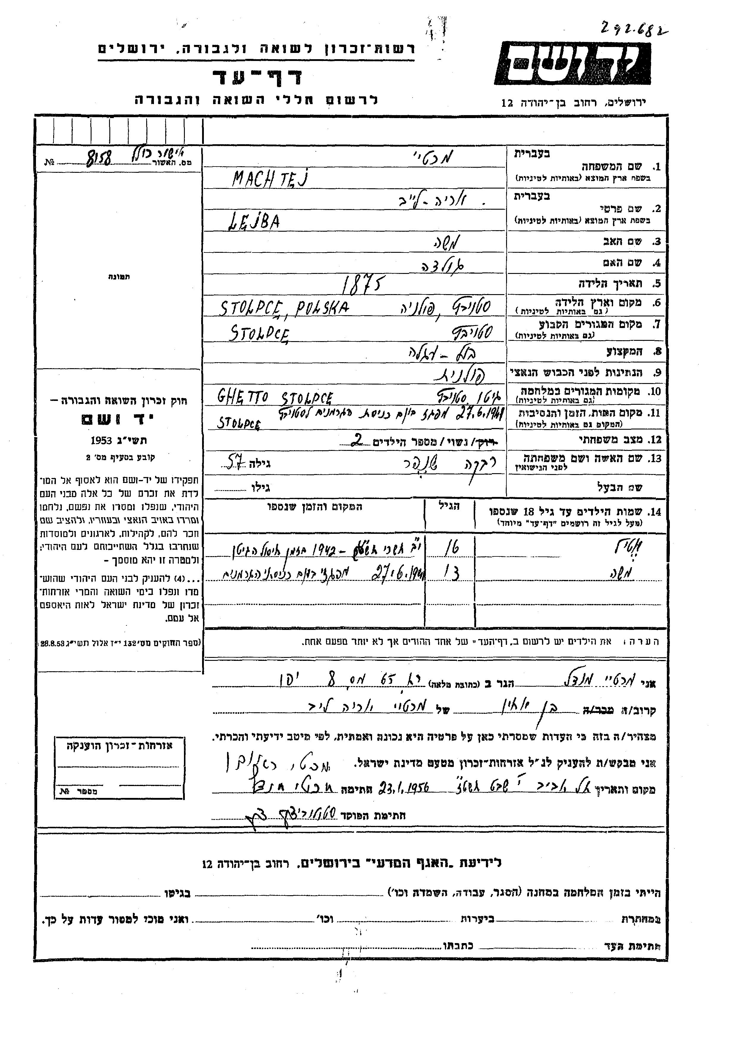 Moshe Machtej wurde Er war der Sohn von Lejba Arie und Rivka, geb. Shnaper. Er war Kind. Vor dem Zweiten Weltkrieg lebte er in Stolpce, Polen. Während des Krieges war er in Stolpce, Polen.