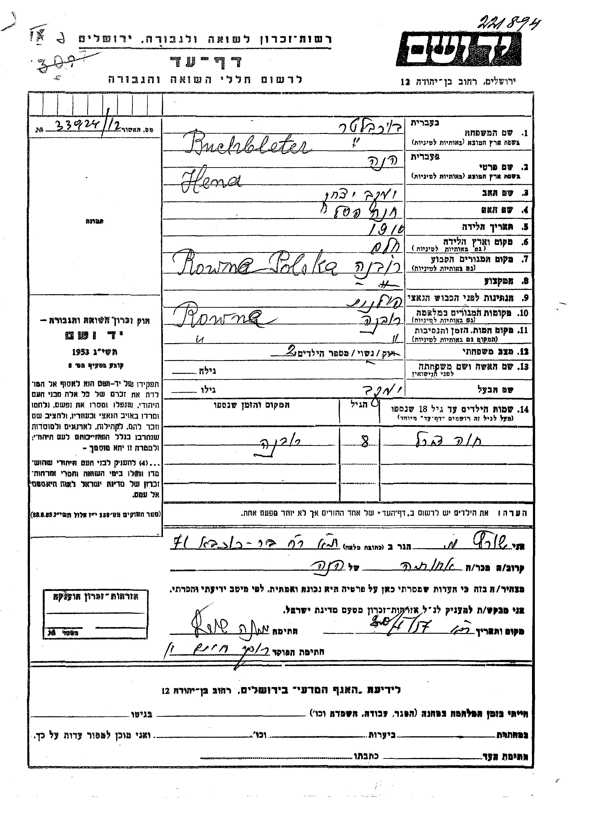 Khava Tzirel Buchbleter wurde Sie war die Tochter von Yaakov und Hena. Sie war Kind. Vor dem Zweiten Weltkrieg lebte sie in Rowne, Polen. Während des Krieges war sie in Rowne, Polen.