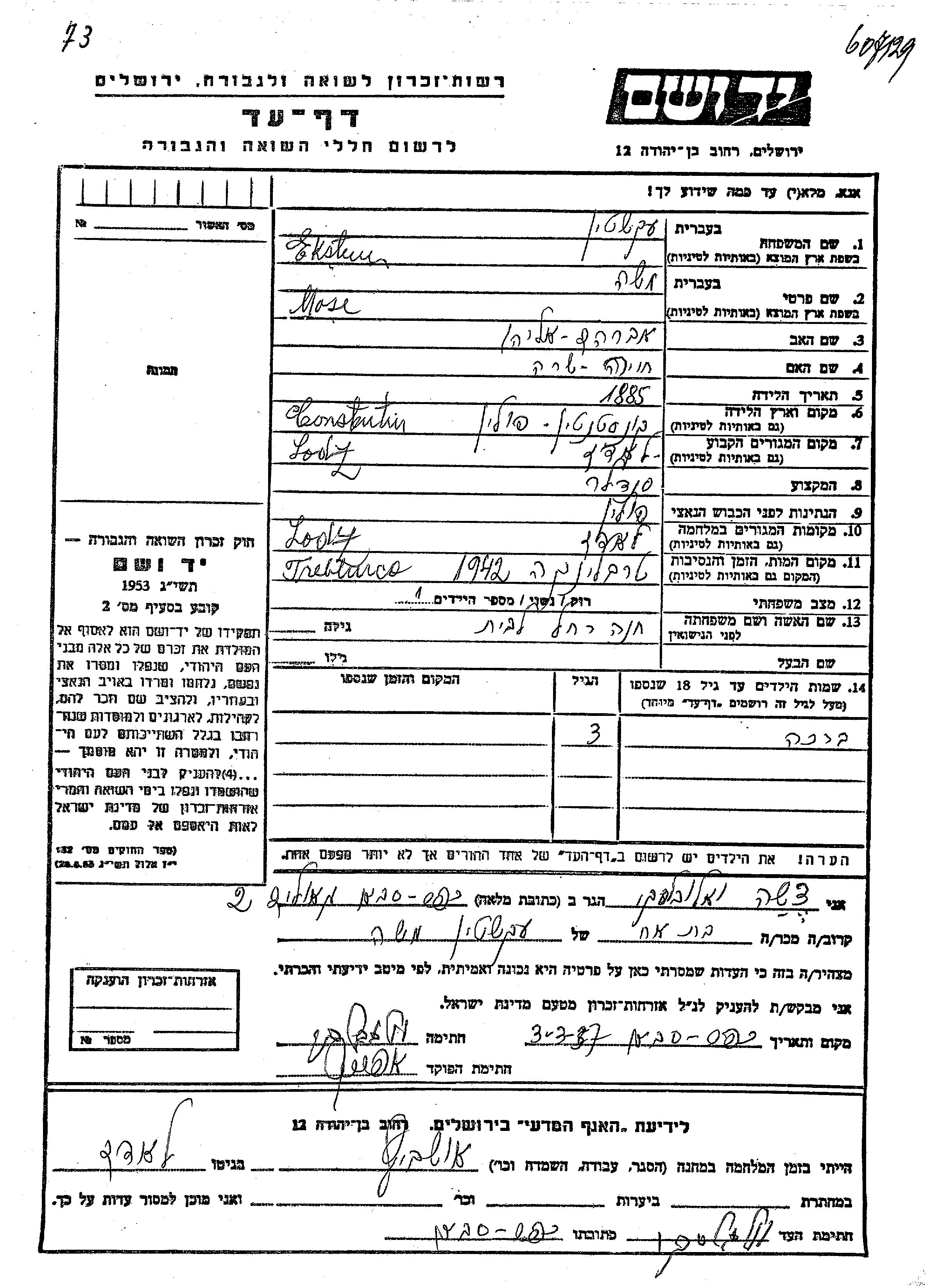 Ekstein Brakha Lodz, Polen Gedenkblatt