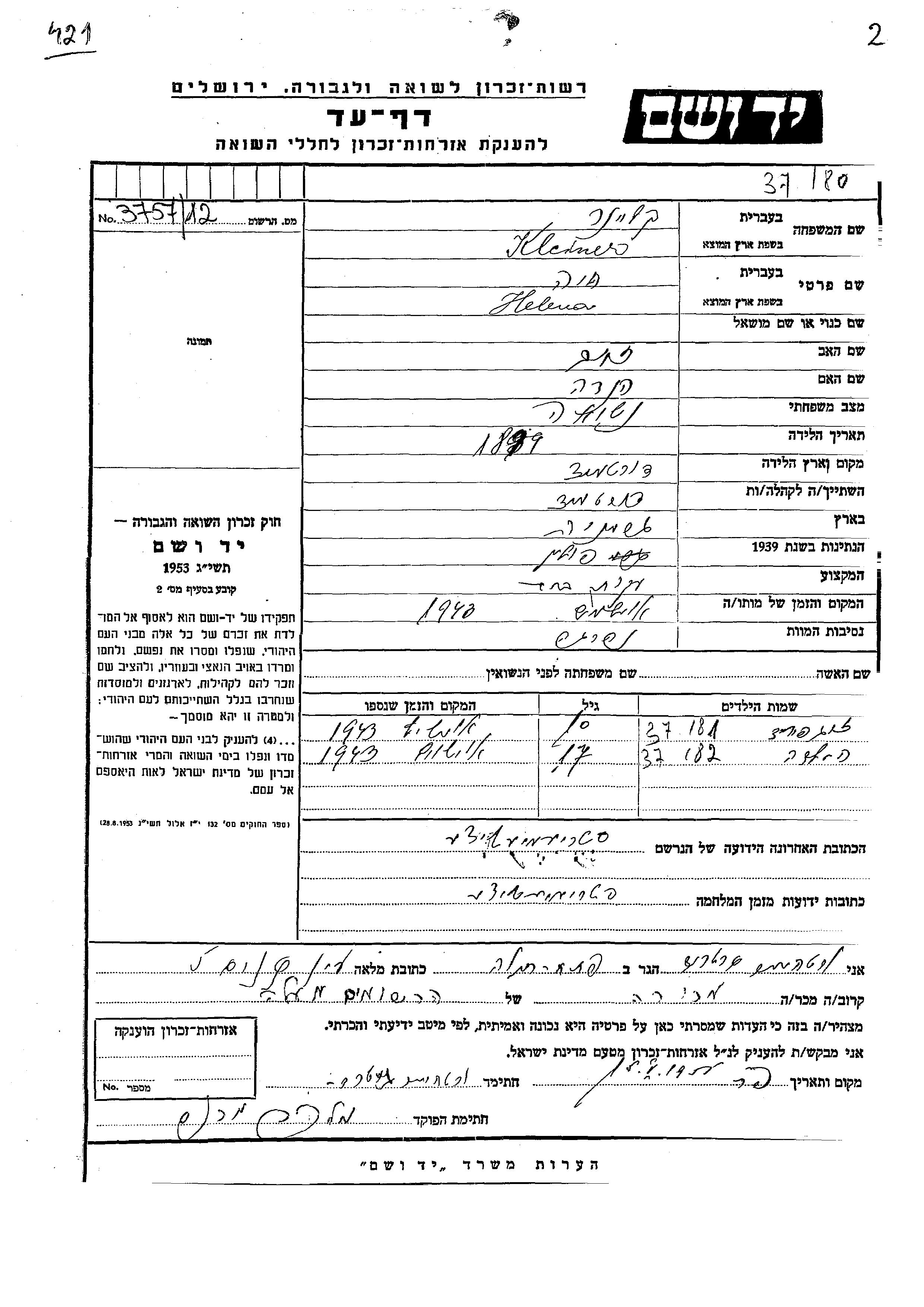 Zigfrid Kleiner wurde Er war der Sohn von Helena Khaia. Er war Kind. Vor dem Zweiten Weltkrieg lebte er in Dortmund, Deutsches Reich. Während des Krieges war er in Strzemieszyce Wielkie, Polen.