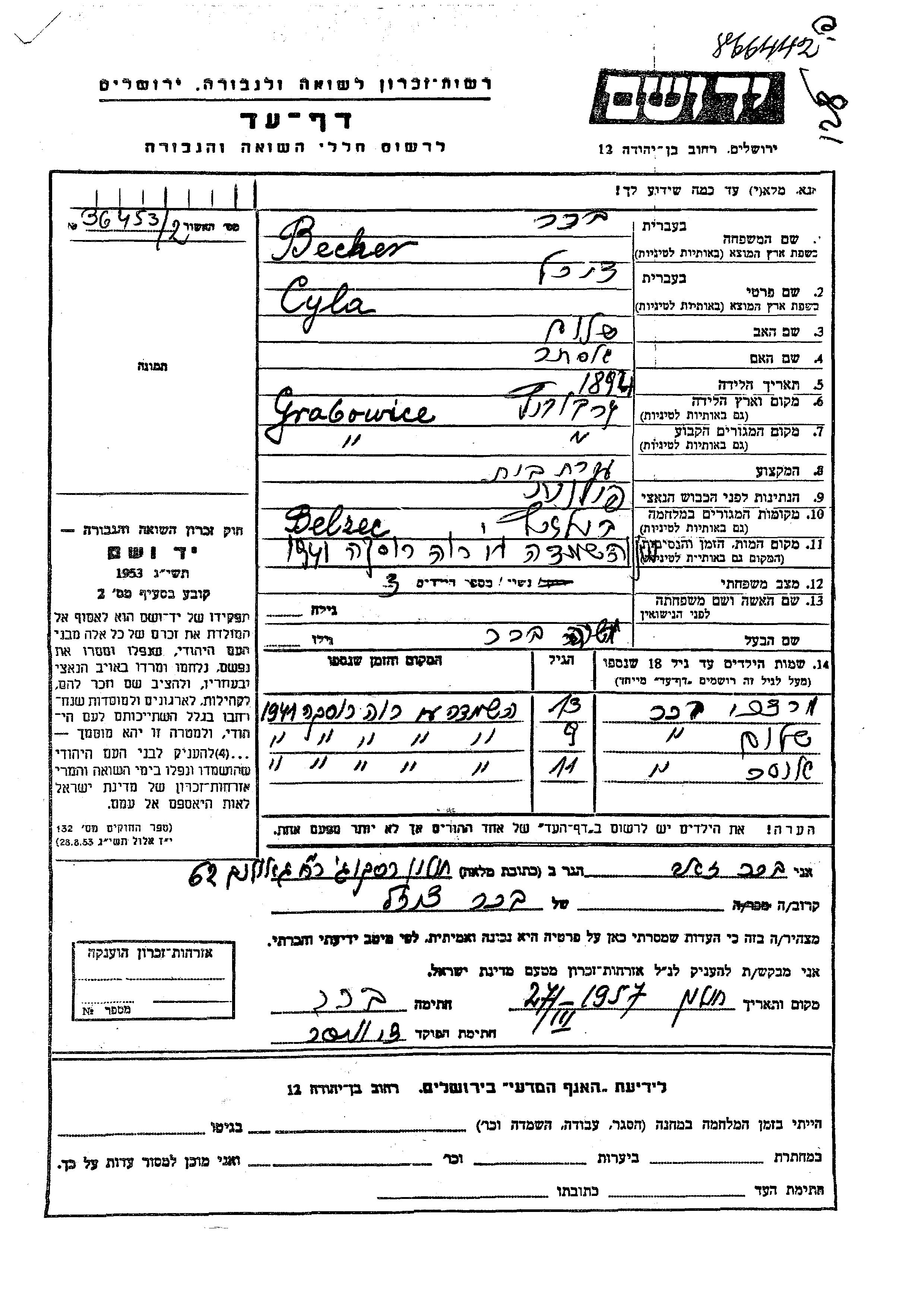 Shalom Becher wurde Er war der Sohn von Moshe und Cyla Tzirel. Er war Kind. Vor dem Zweiten Weltkrieg lebte er in Grabowiec, Polen. Während des Krieges war er in Belzec, Polen.