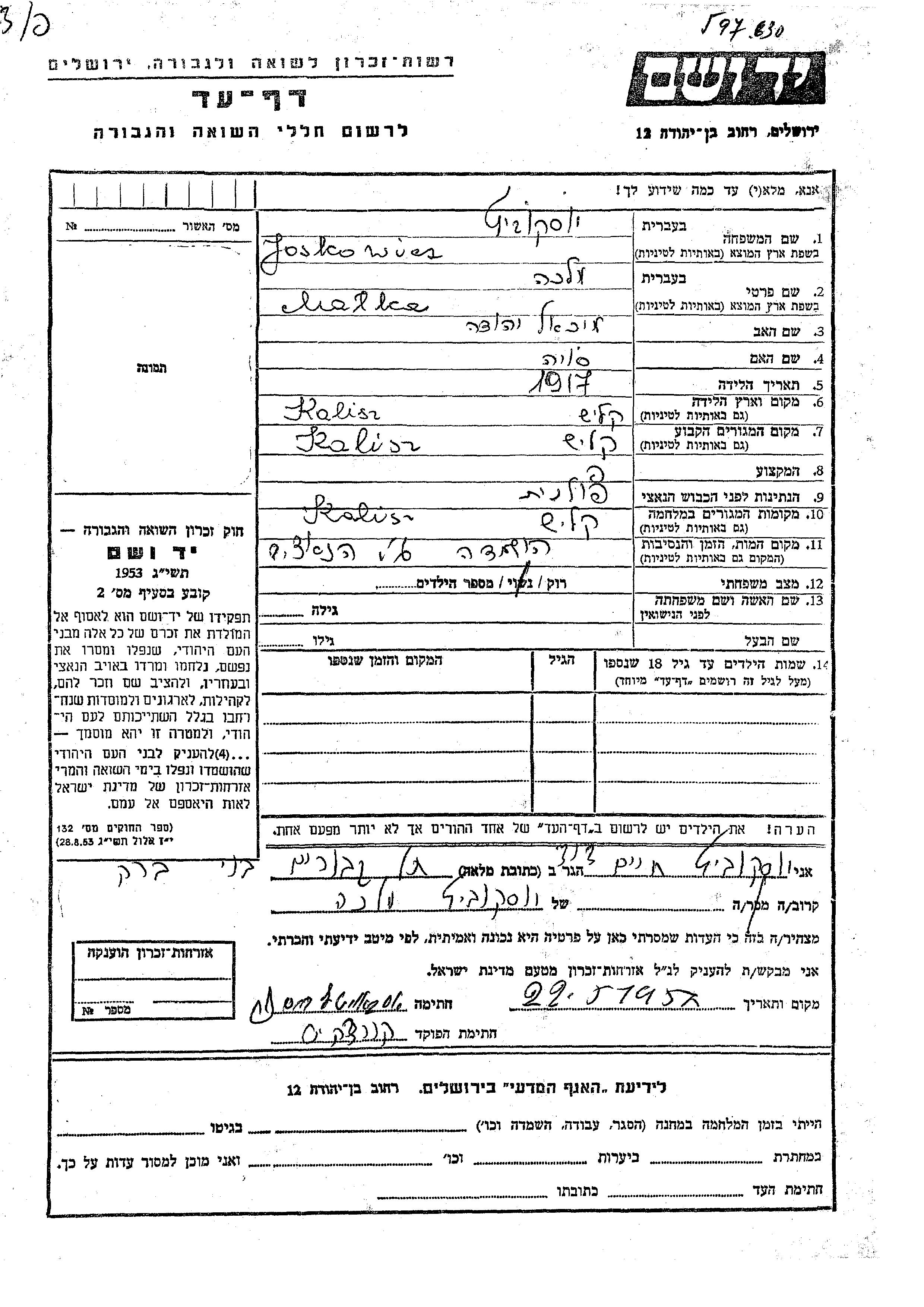 Malke Joskowicz wurde im Jahr 1917 in Kalisz, Polen geboren. Sie war die Tochter von Mikhael Yehuda und Sara. Sie war Ledig. Vor dem Zweiten Weltkrieg lebte sie in Kalisz, Polen. Während des Krieges war sie in Kalisz, Polen.