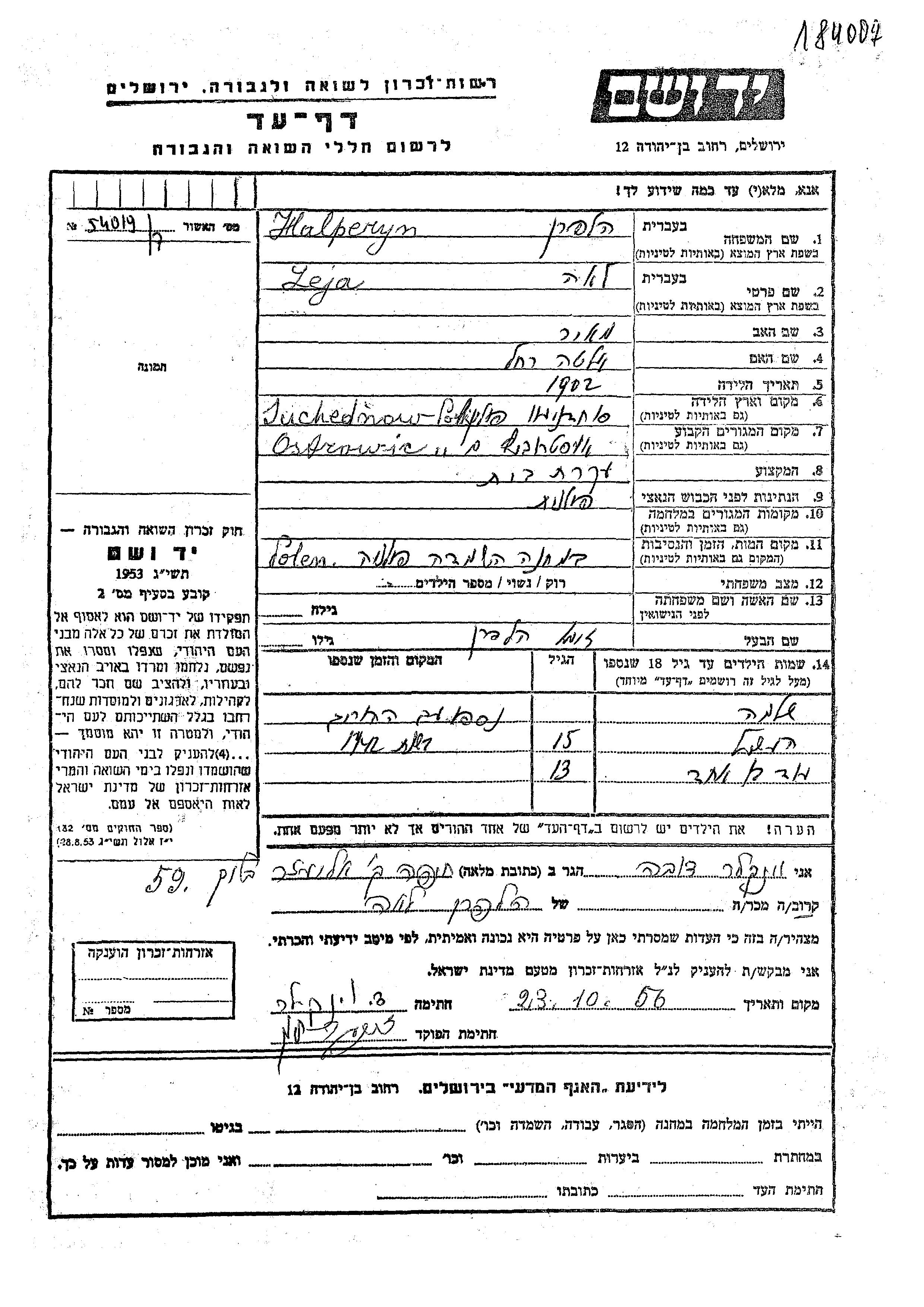 Yehoshua Halperyn Halpern wurde Er war der Sohn von Zimel und Leja. Er war Kind. Vor dem Zweiten Weltkrieg lebte er in Ostrowiec, Polen.