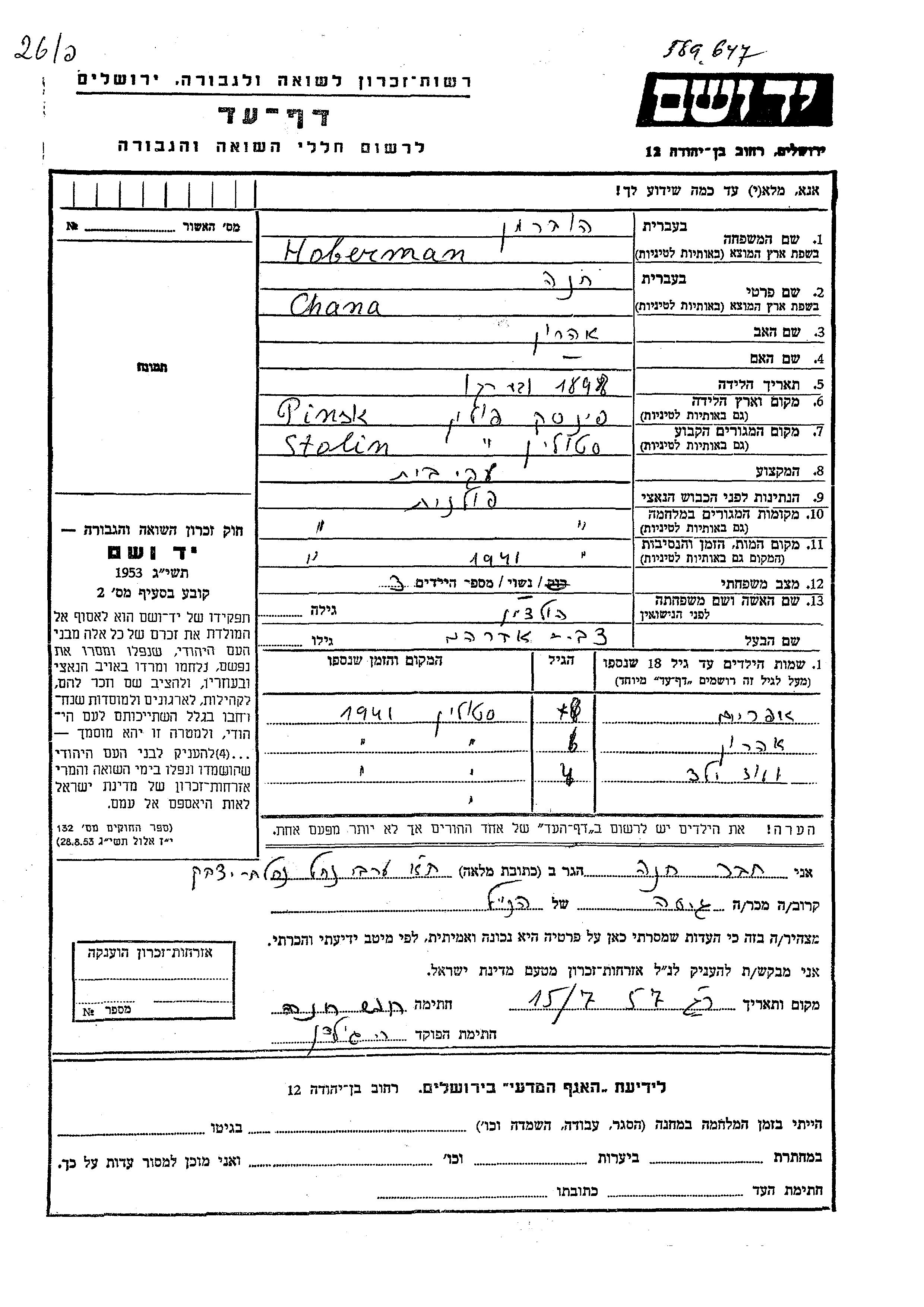 Aharon Hoberman wurde Er war der Sohn von Tzvi Avraham und Chana, geb. Holden. Er war Kind. Vor dem Zweiten Weltkrieg lebte er in Stolin, Polen. Während des Krieges war er in Stolin, Polen.