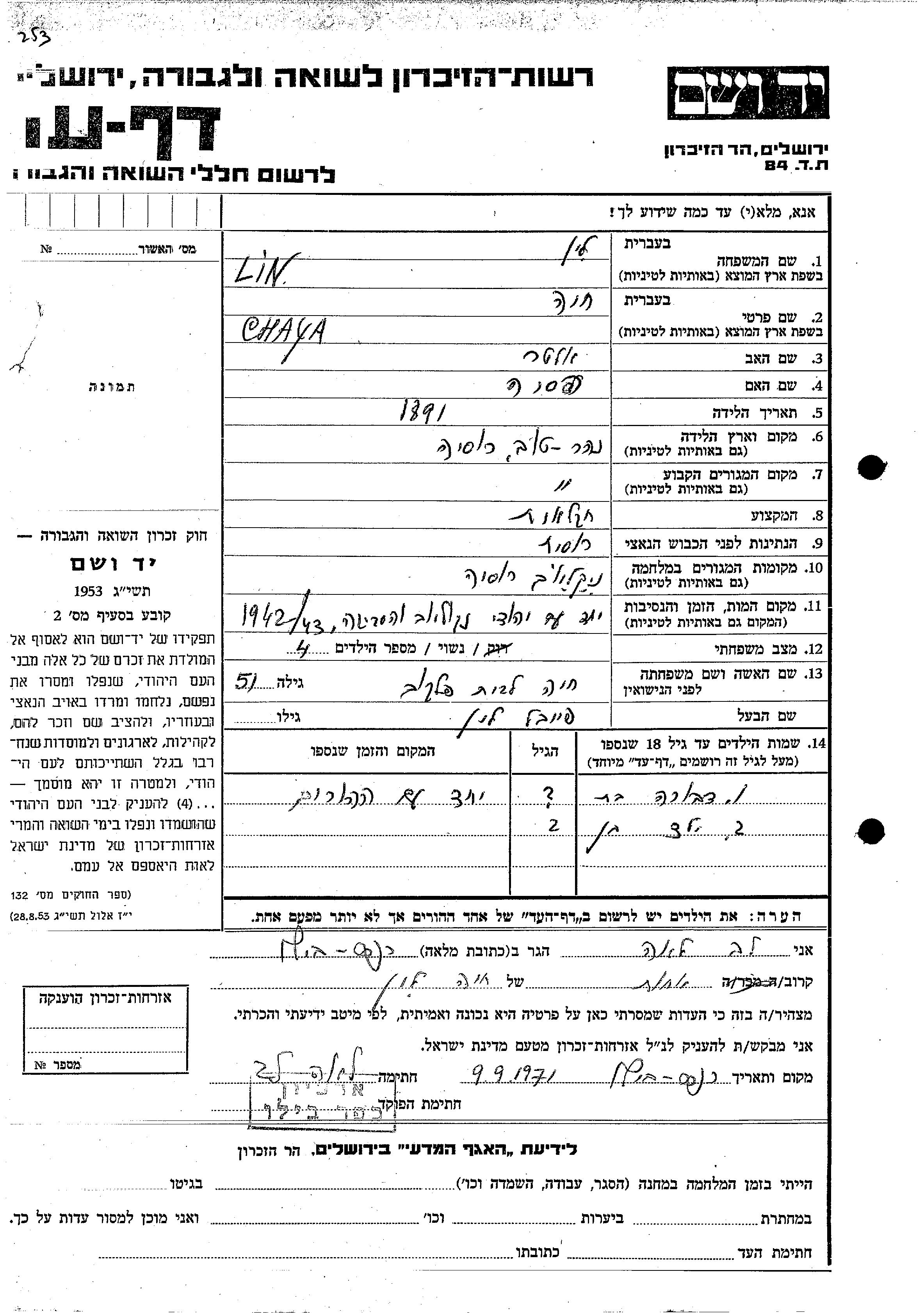 Dvora Lin wurde Sie war die Tochter von Faivel und Chaya, geb. Falkov. Sie war Kind. Vor dem Zweiten Weltkrieg lebte sie in Nagartav, Ukraine (UdSSR). Während des Krieges war sie in Nikolajev, Ukraine (UdSSR).