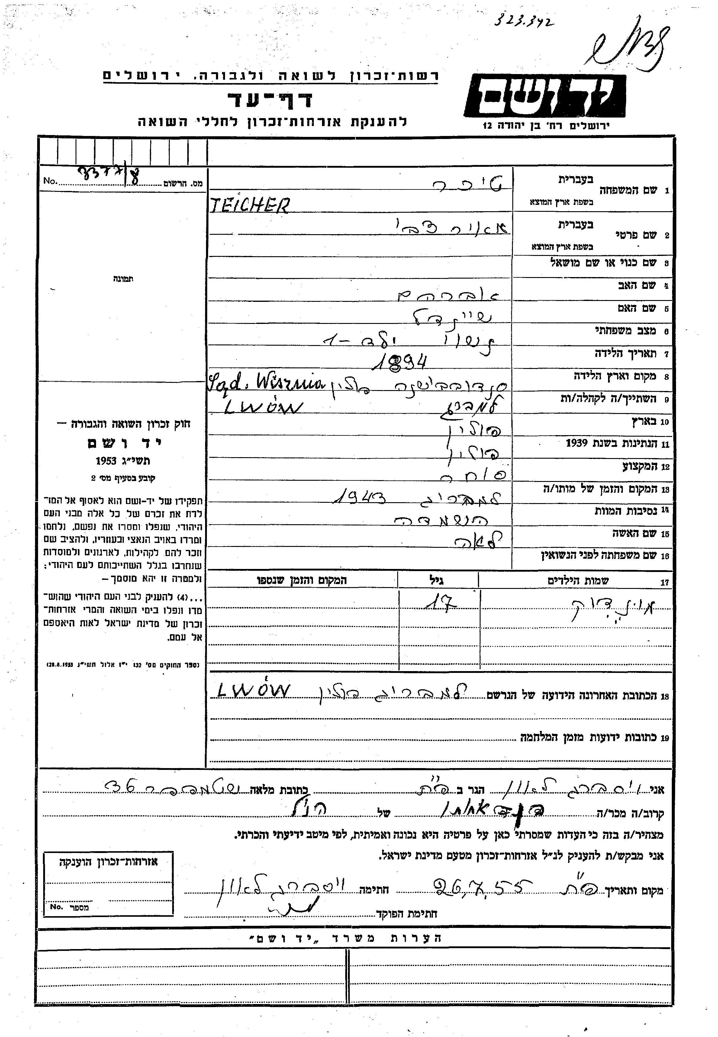 Mendel Teicher Teikher wurde Er war der Sohn von Meir Tzvi und Lea. Er war Kind. Vor dem Zweiten Weltkrieg lebte er in Lwow, Polen. Während des Krieges war er in Lwow, Polen.