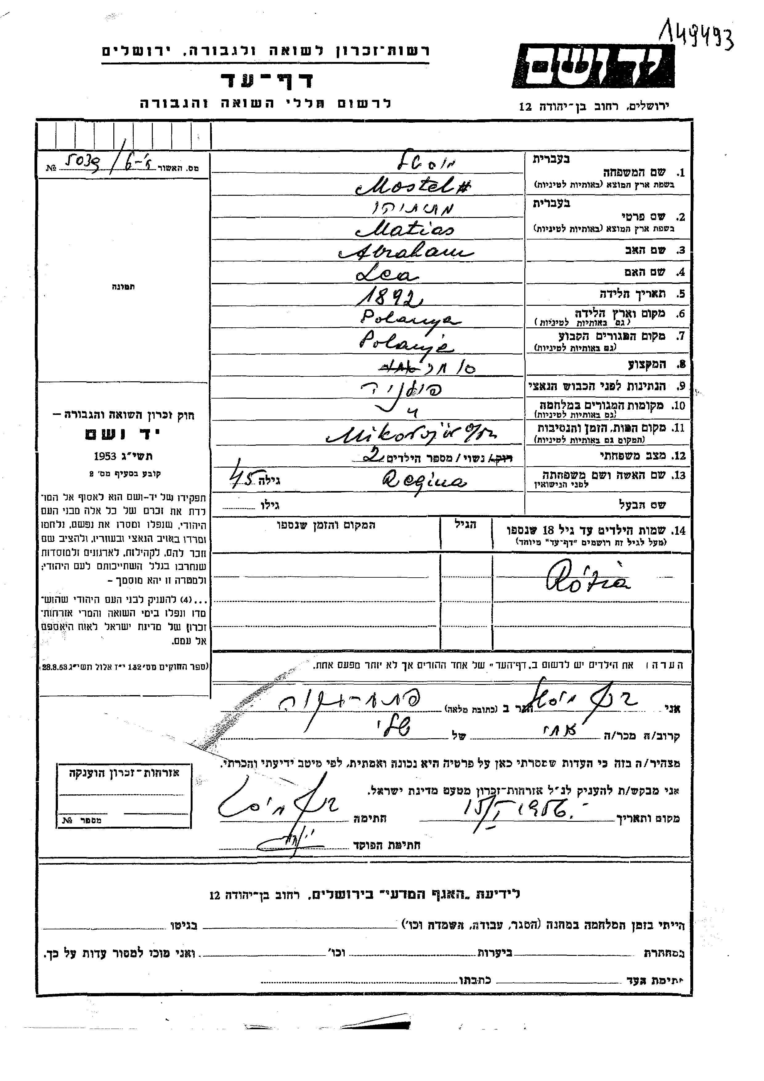 Rozia Mostel wurde Sie war die Tochter von Matias Matitiahu und Regina. Sie war Kind. Vor dem Zweiten Weltkrieg lebte sie in Polen. Während des Krieges war sie in Polen.