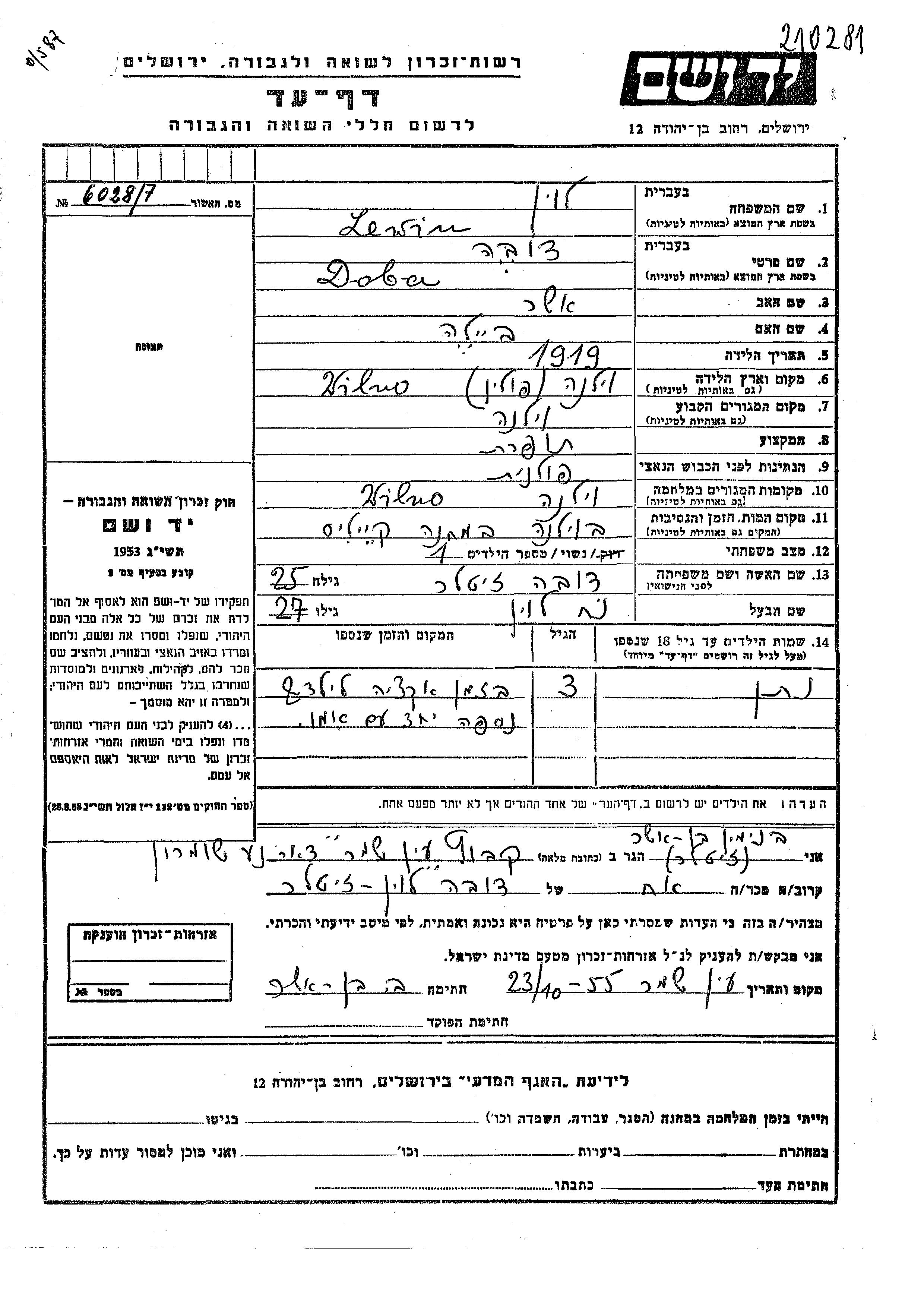 Natan Lewin wurde Er war der Sohn von Noakh und Doba, geb. Zitler. Er war Kind. Vor dem Zweiten Weltkrieg lebte er in Wilno, Polen. Während des Krieges war er in Wilno, Polen.