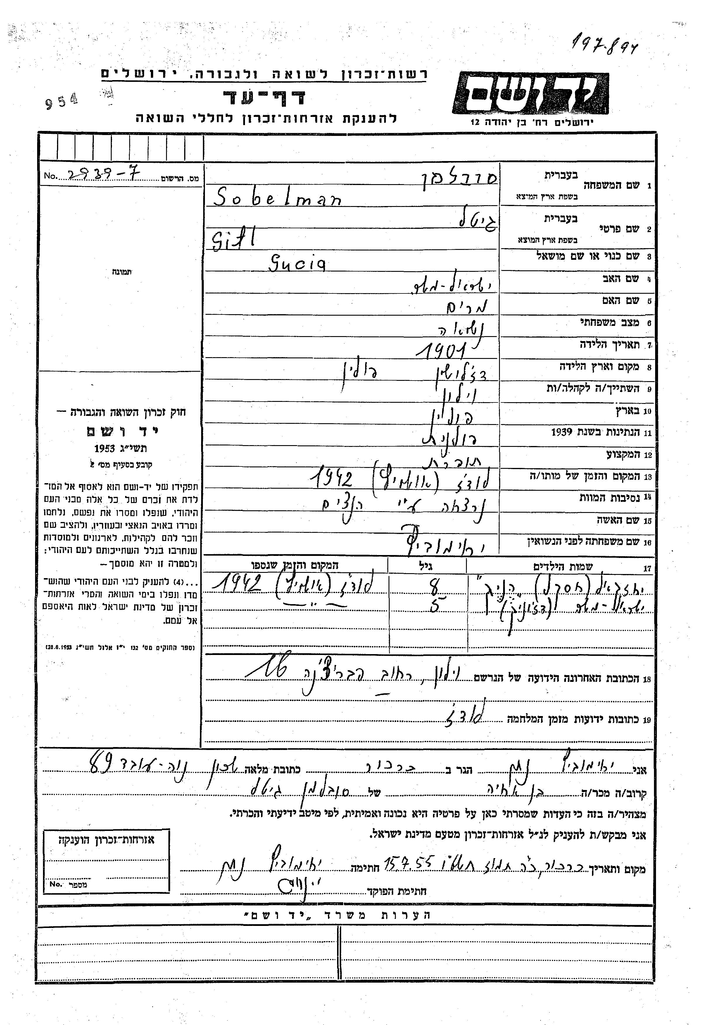 Yisrael Moshe Sobelman wurde Er war der Sohn von Gitl Gucia, geb. Iakhimovitz. Er war Kind. Vor dem Zweiten Weltkrieg lebte er in Wielun, Polen. Während des Krieges war er in Lodz, Polen.