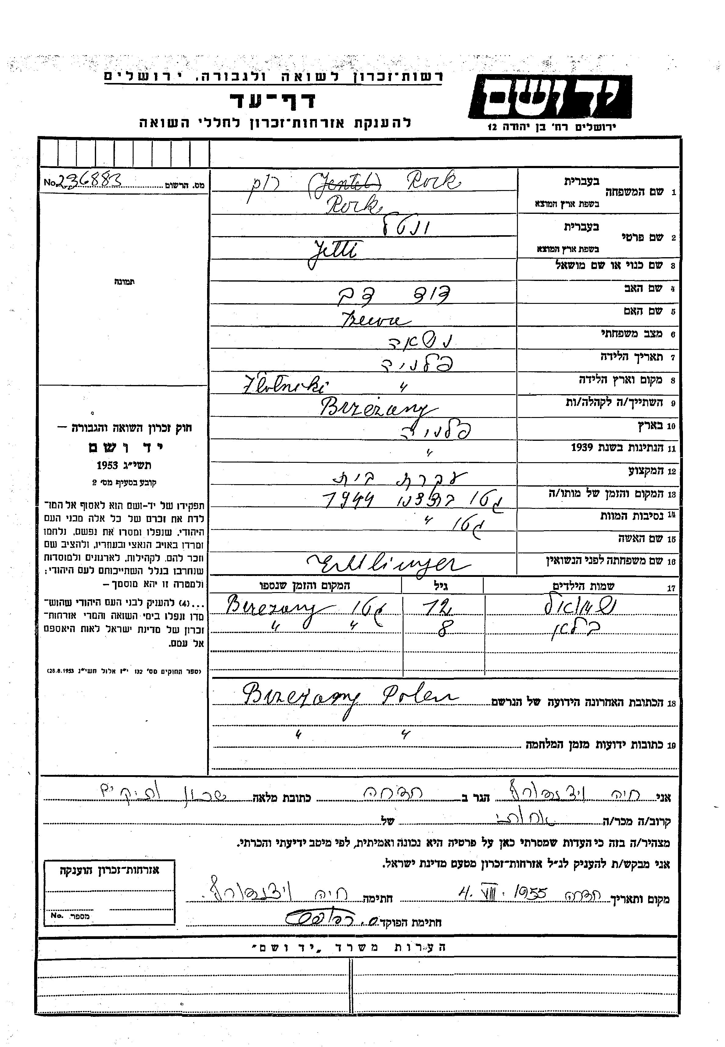 Shmuel Rock wurde Er war der Sohn von Yetti Yentl, geb. Echtlinger. Er war Kind. Vor dem Zweiten Weltkrieg lebte er in Brzezany, Polen. Während des Krieges war er in Brzezany, Polen.