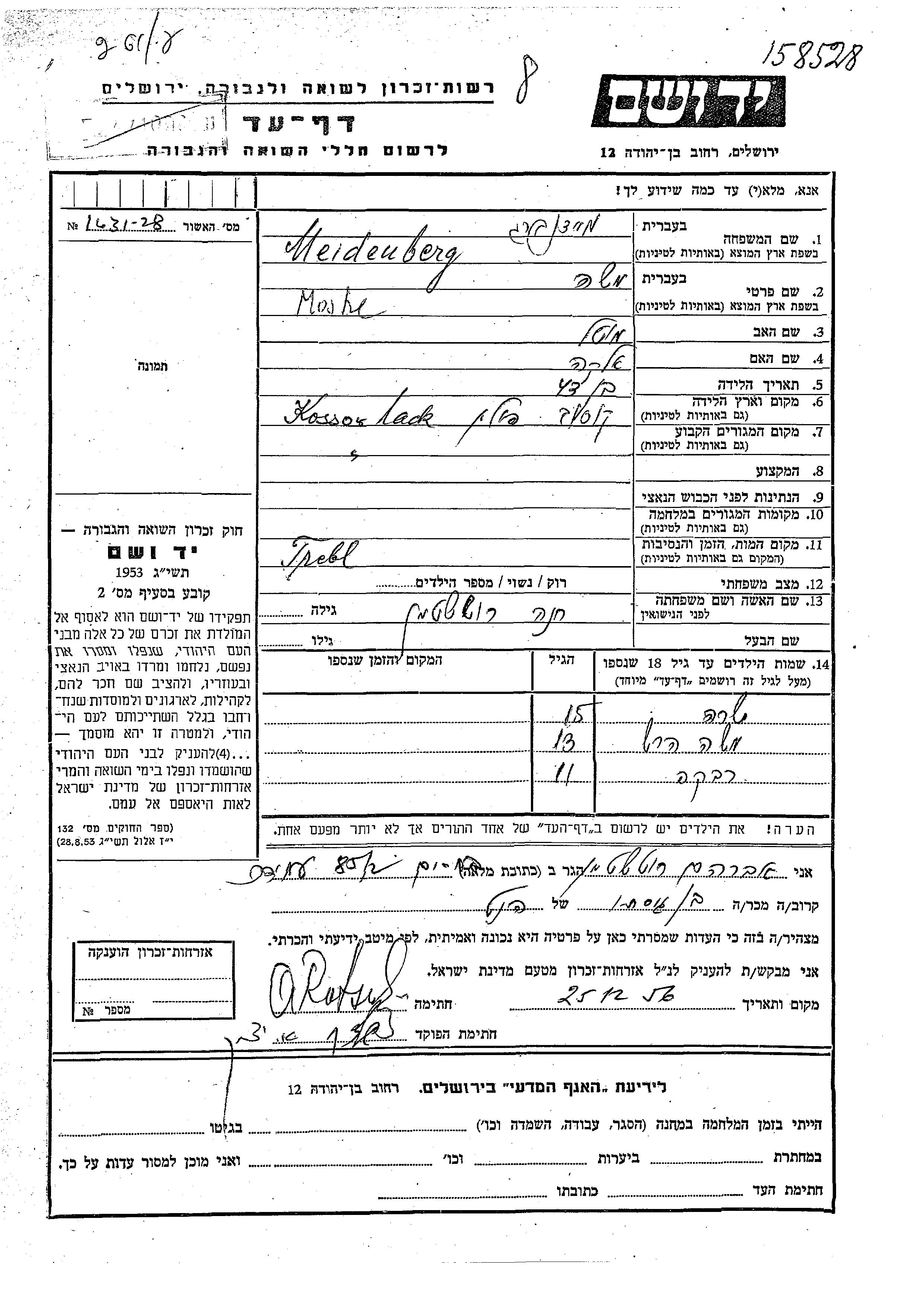 Moshe Hersh Meidenberg wurde Er war der Sohn von Moshe und Khana, geb. Rotshtein. Er war Kind. Vor dem Zweiten Weltkrieg lebte er in Kosow Lacki, Polen.