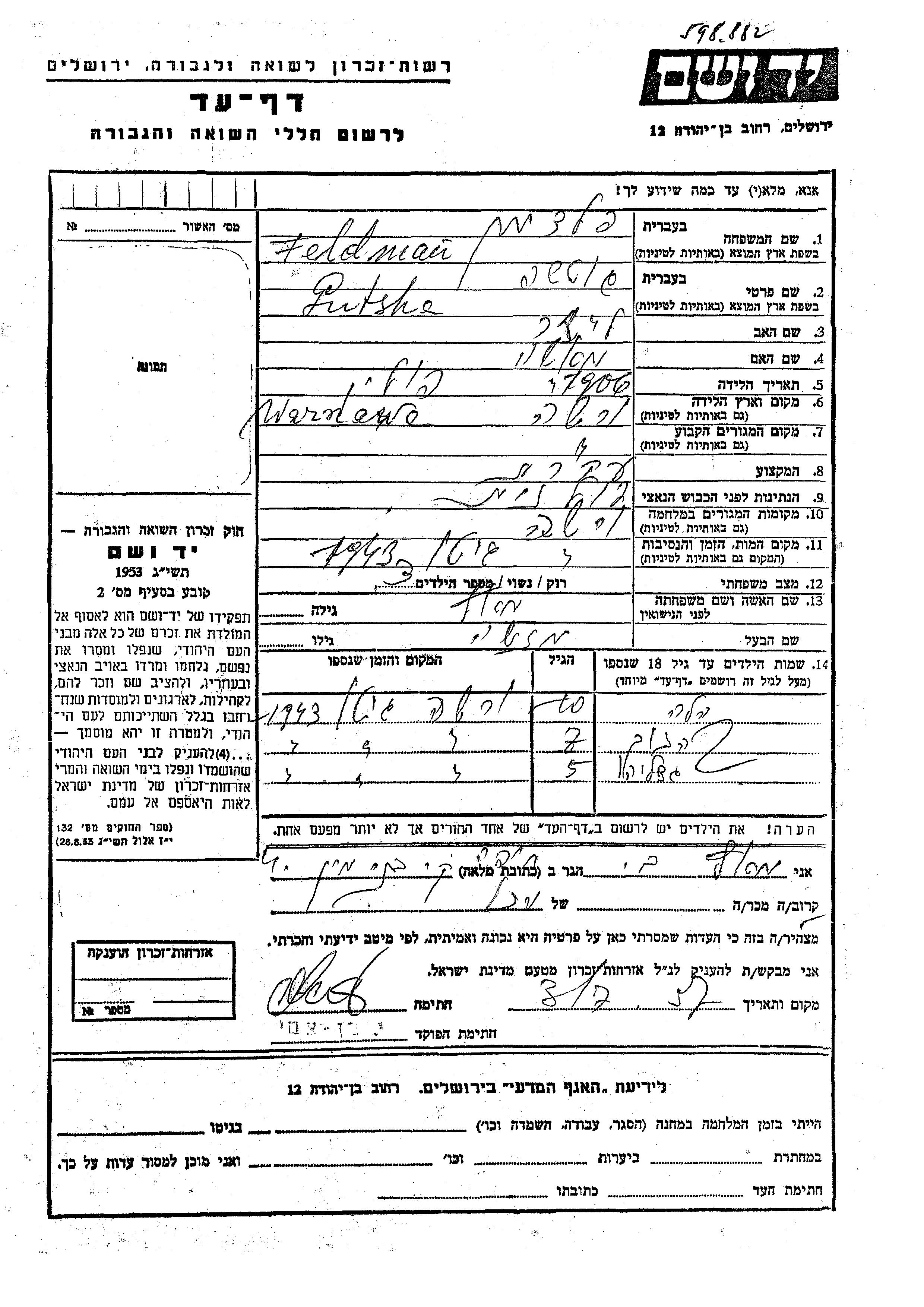 Henoch Feldman wurde Er war der Sohn von Menashe und Gutsche, geb. Matz. Er war Kind. Vor dem Zweiten Weltkrieg lebte er in Warsaw, Polen. Während des Krieges war er in Warsaw, Polen.