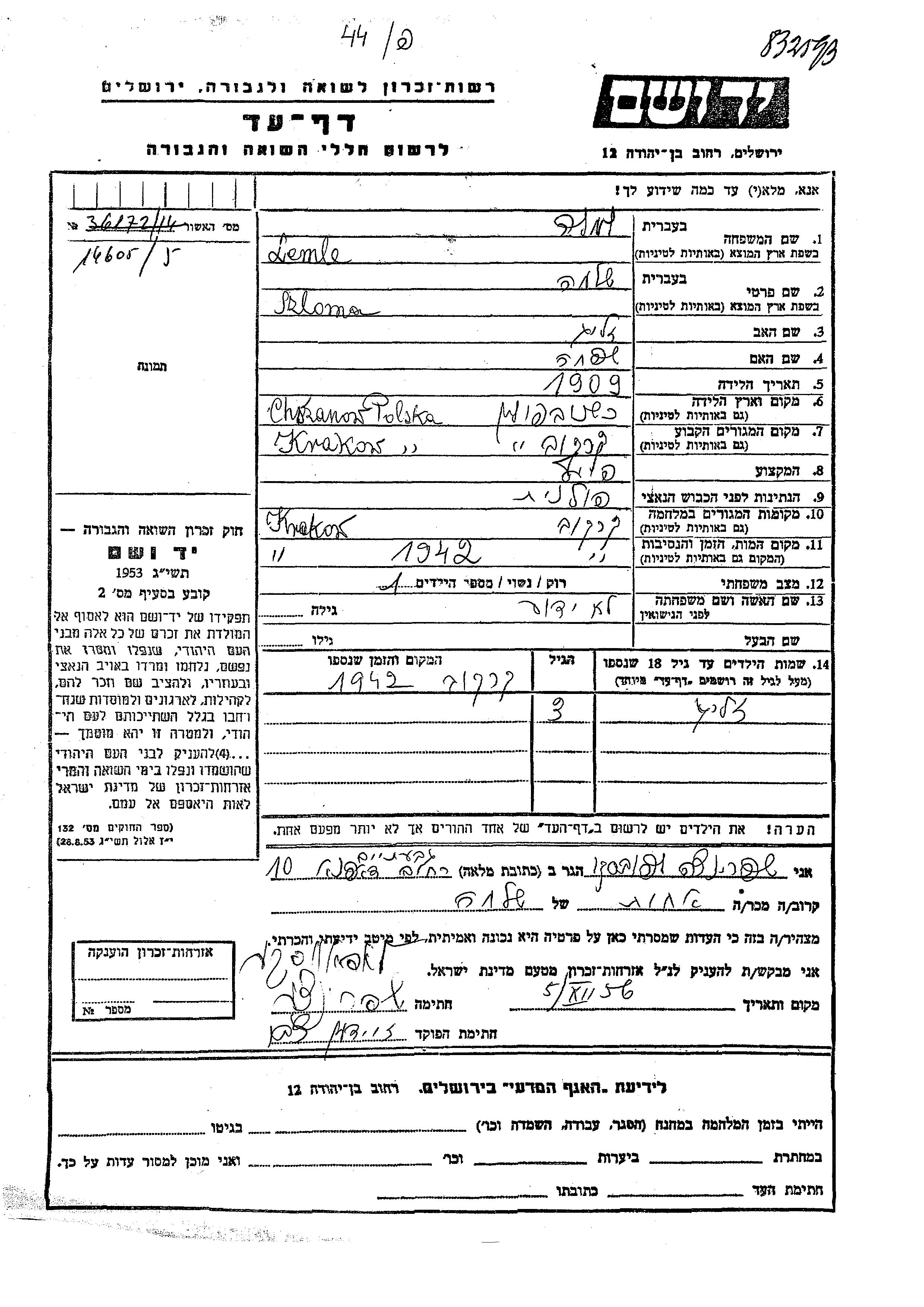 Zelig Lemle wurde Er war der Sohn von Szloma. Er war Kind. Vor dem Zweiten Weltkrieg lebte er in Krakow, Polen. Während des Krieges war er in Krakow, Polen.