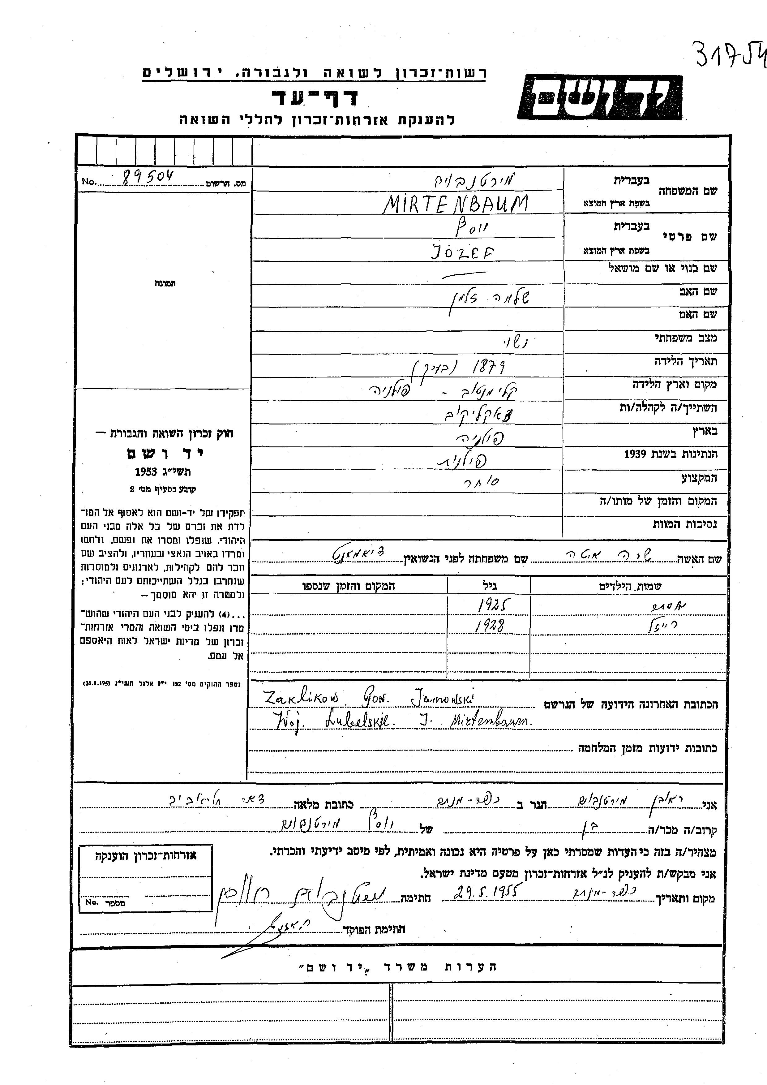 Reizl Mirtenbaum wurde im Jahr 1928 geboren. Sie war die Tochter von Jozef und Sara Ita, geb. Diamant. Sie war Kind. Vor dem Zweiten Weltkrieg lebte sie in Zaklikow, Polen. Während des Krieges war sie in Zaklikow, Polen.
