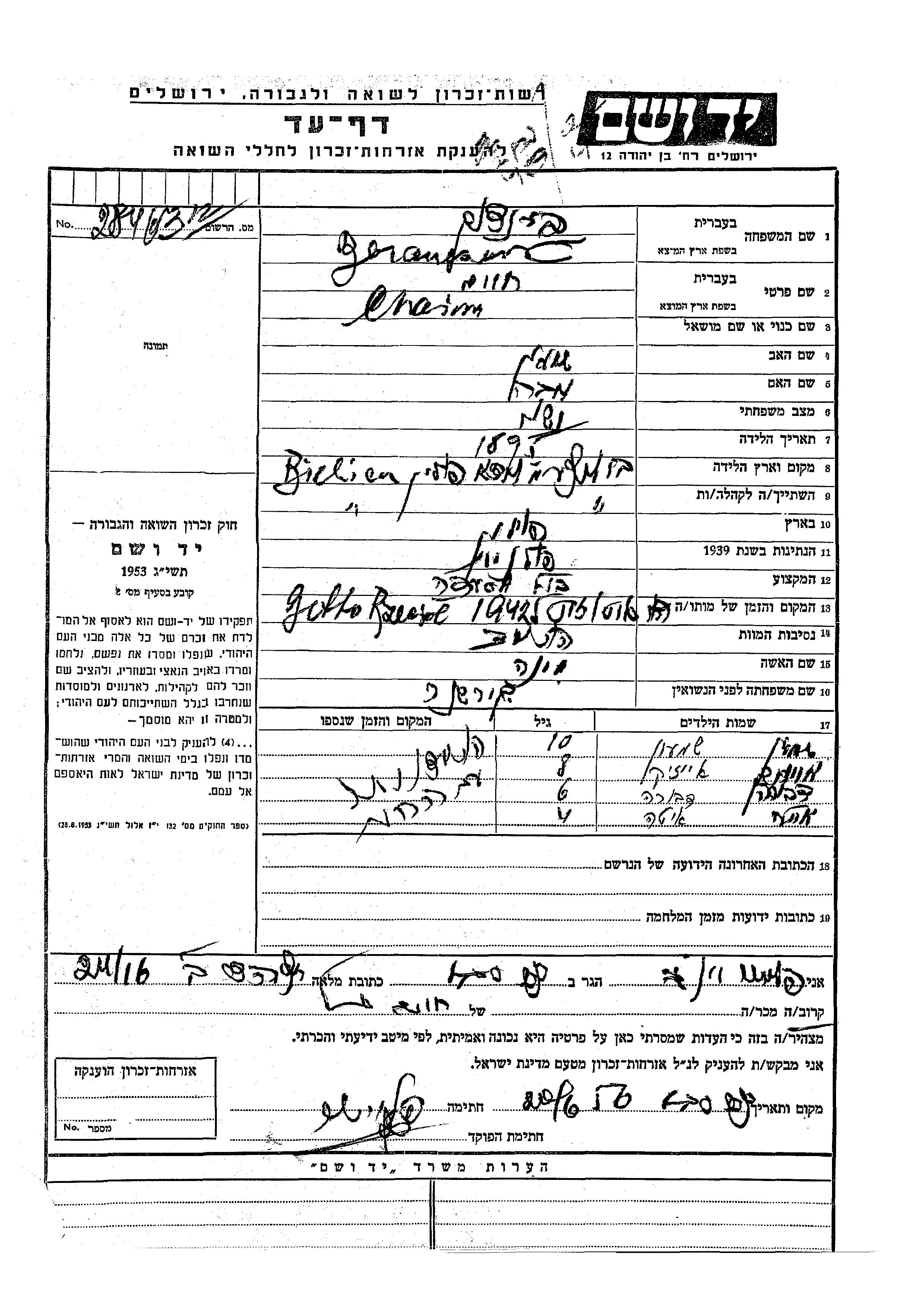 Aizik Baranczuk Branchuk wurde Er war der Sohn von Chaim und Mina, geb. Kirshner. Er war Kind. Vor dem Zweiten Weltkrieg lebte er in Bielica, Polen. Während des Krieges war er in Bielica, Polen.