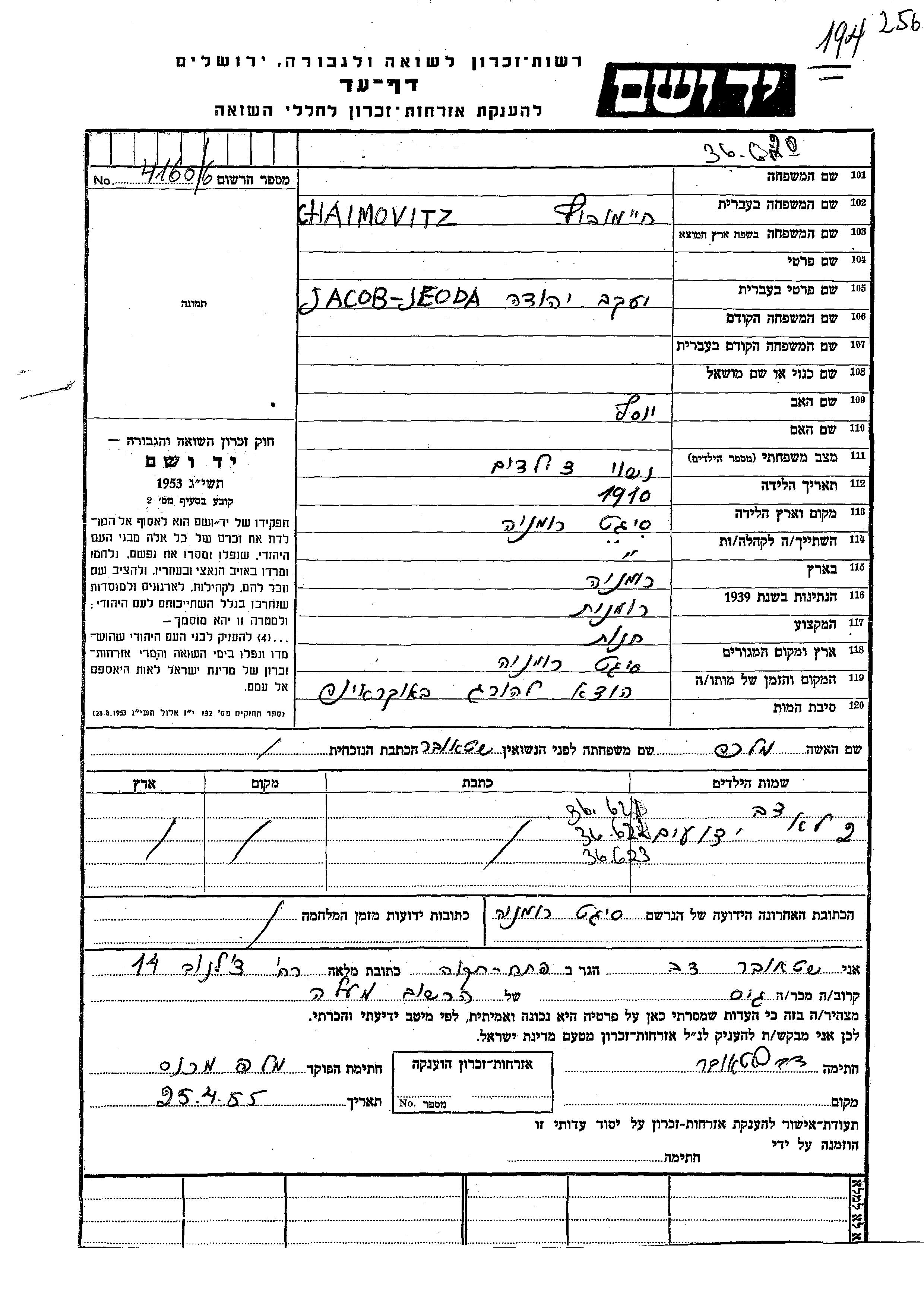 Dov Chaimovitz wurde Er war der Sohn von Jacob Jeoda und Malka, geb. Shtauber. Er war Kind. Vor dem Zweiten Weltkrieg lebte er in Siget, Rumänien.