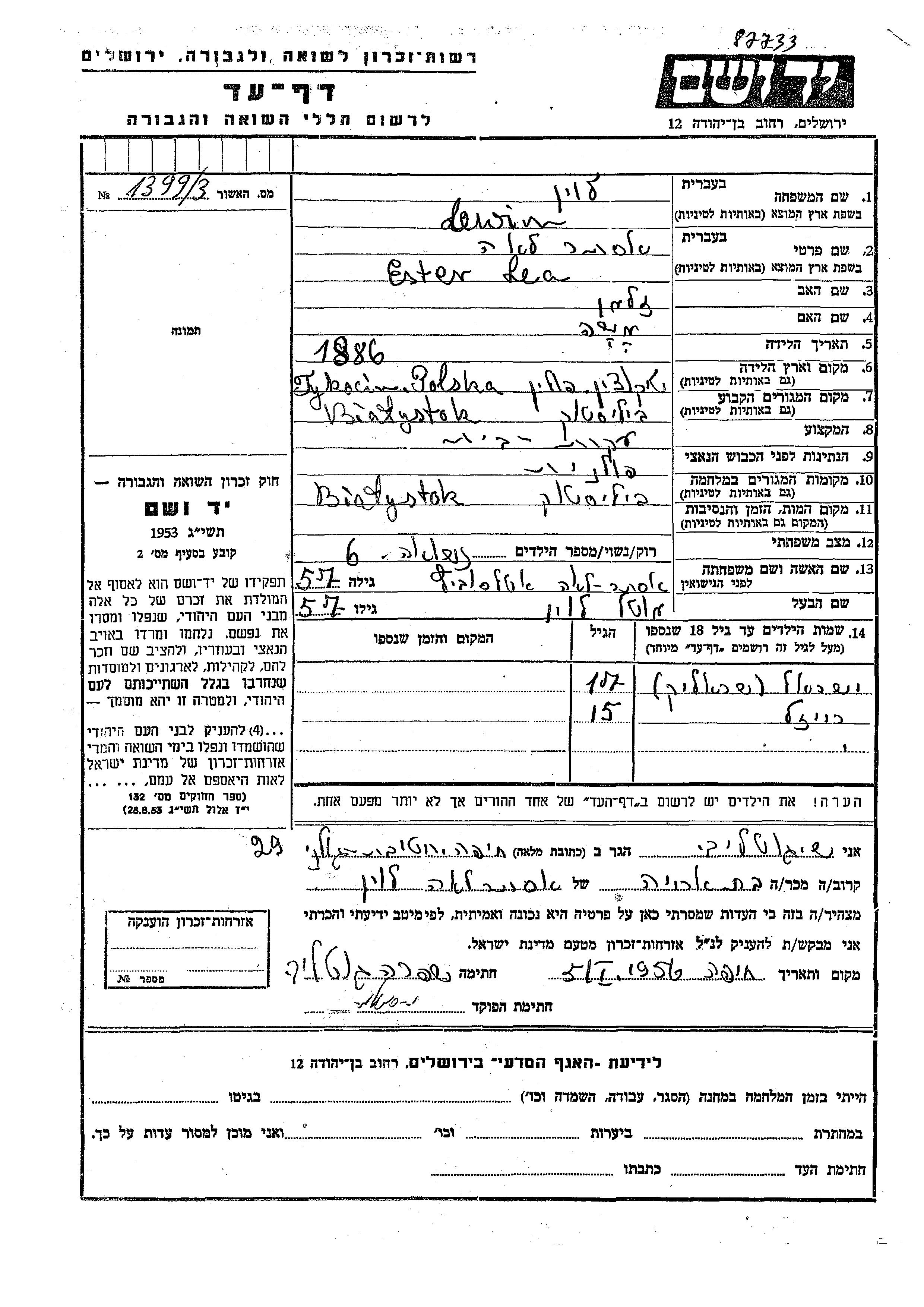 Yisrael Lewin wurde Er war der Sohn von Gutl und Ester Lea, geb. Atlasovitz. Er war Kind. Vor dem Zweiten Weltkrieg lebte er in Bialistok, Polen. Während des Krieges war er in Bialistok, Polen.