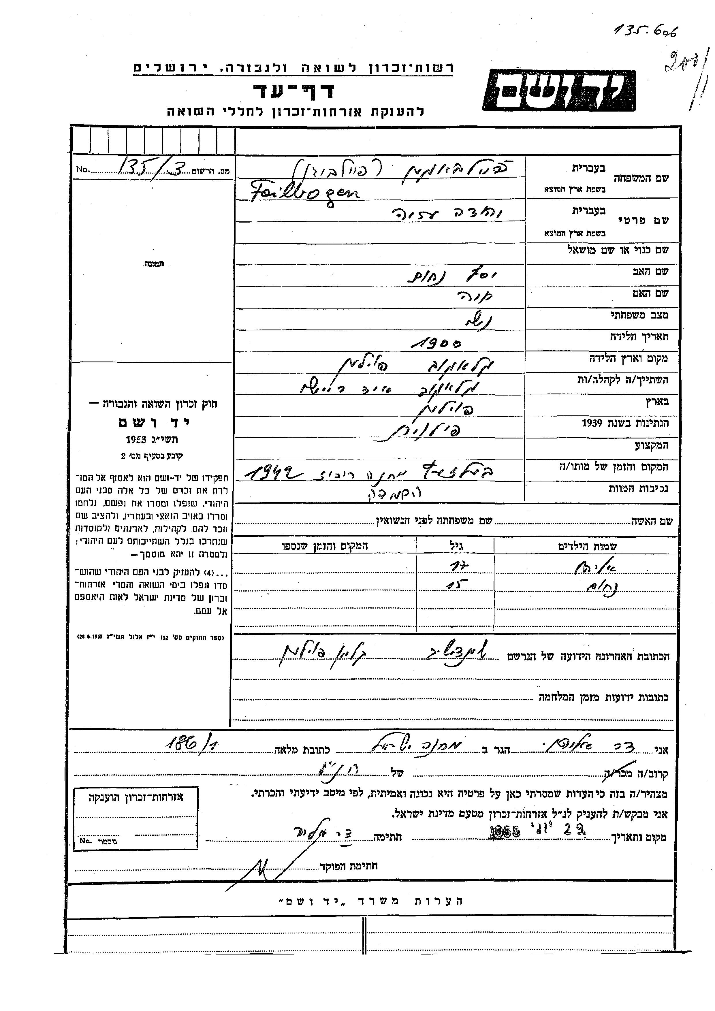 Eliahu Feilbogen wurde Er war der Sohn von Yehuda Ezia. Er war Kind. Vor dem Zweiten Weltkrieg lebte er in Glogow, Polen. Während des Krieges war er in Klewań, Polen.