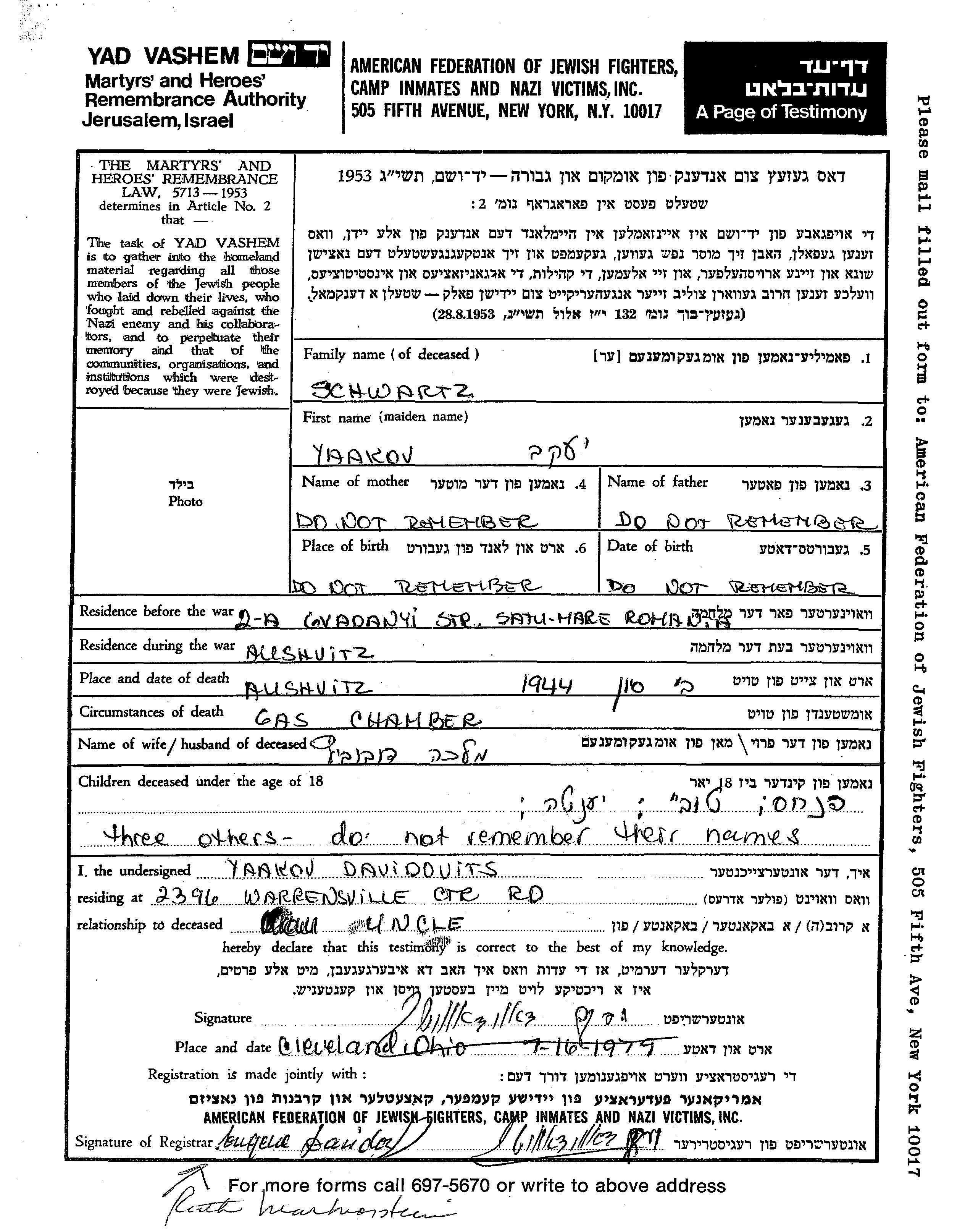 Pinkhas Schwartz wurde Er war der Sohn von Jaakov und Malka, geb. Dobovitz. Er war Kind. Vor dem Zweiten Weltkrieg lebte er in Satu Mare, Rumänien. Während des Krieges war er in Auschwitz, Polen.