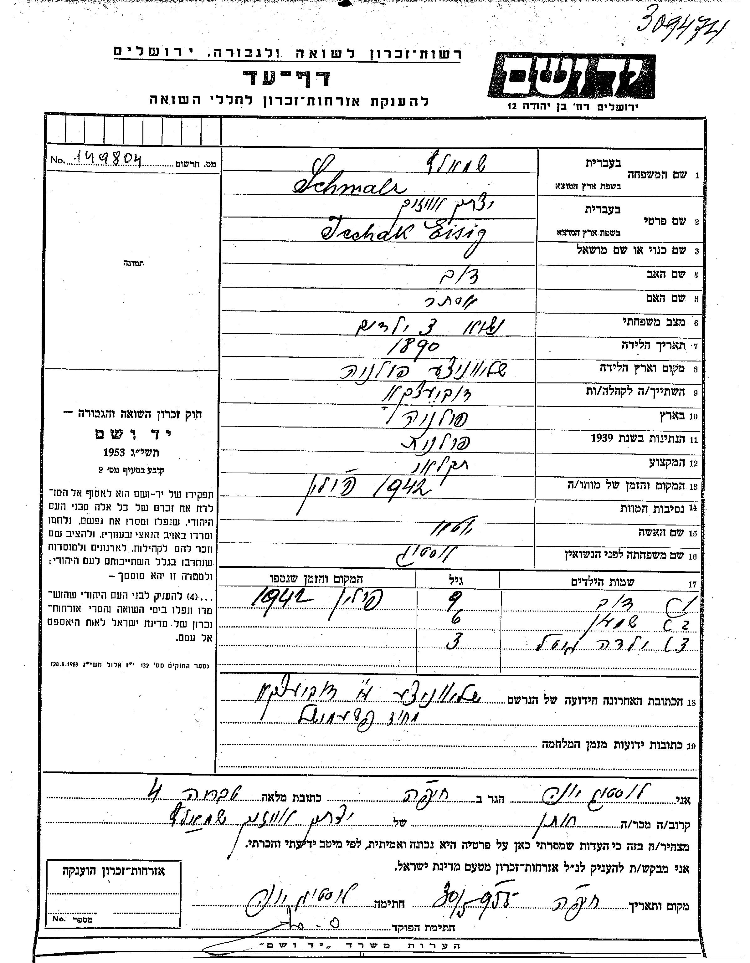 Gitel Schmalz wurde Sie war die Tochter von Jcchak und Iuta, geb. Lustig. Sie war Kind. Vor dem Zweiten Weltkrieg lebte sie in Sliwnica, Polen. Während des Krieges war sie in Sliwnica, Polen.