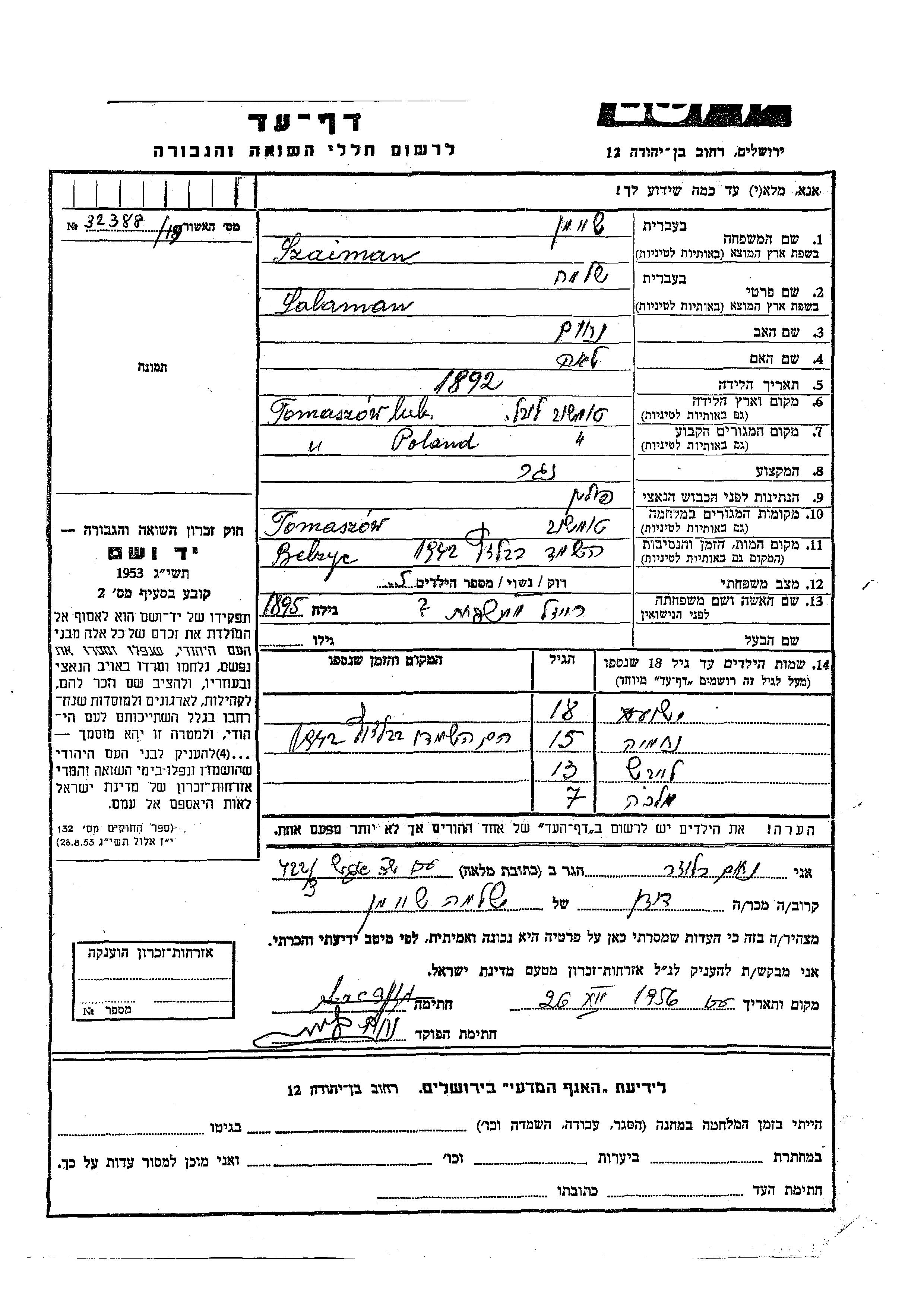 Nekhemia Szaiman wurde Er war der Sohn von Salaman und Reizl. Er war Kind. Vor dem Zweiten Weltkrieg lebte er in Tomaszow Lubelski, Polen. Während des Krieges war er in Tomaszow, Polen.