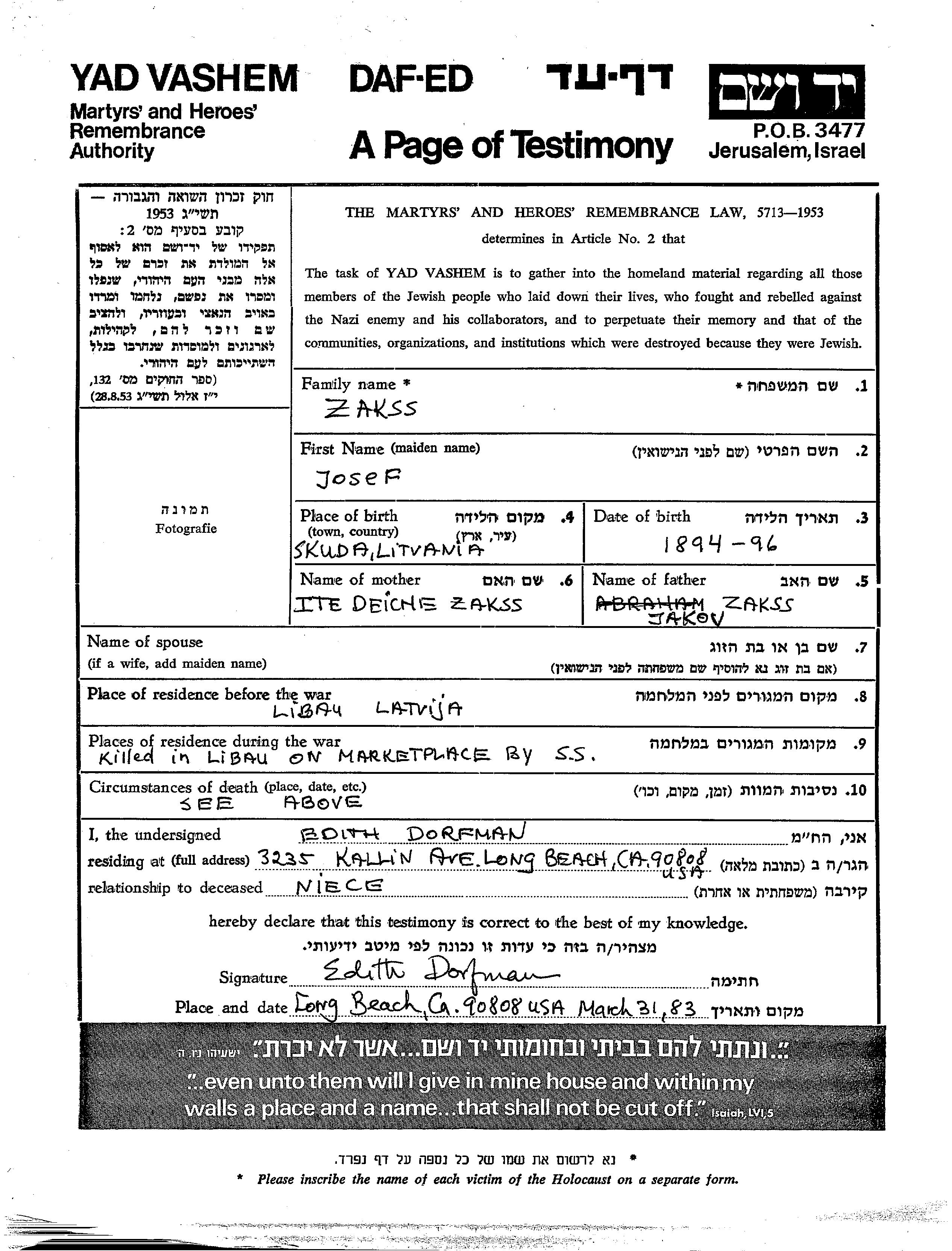 Josef Zakss wurde im Jahr 1894 in Skud, Litauen geboren. Er war der Sohn von Jakov und Ite. Vor dem Zweiten Weltkrieg lebte er in Libau, Lettland. Während des Krieges war er in Libau, Lettland.