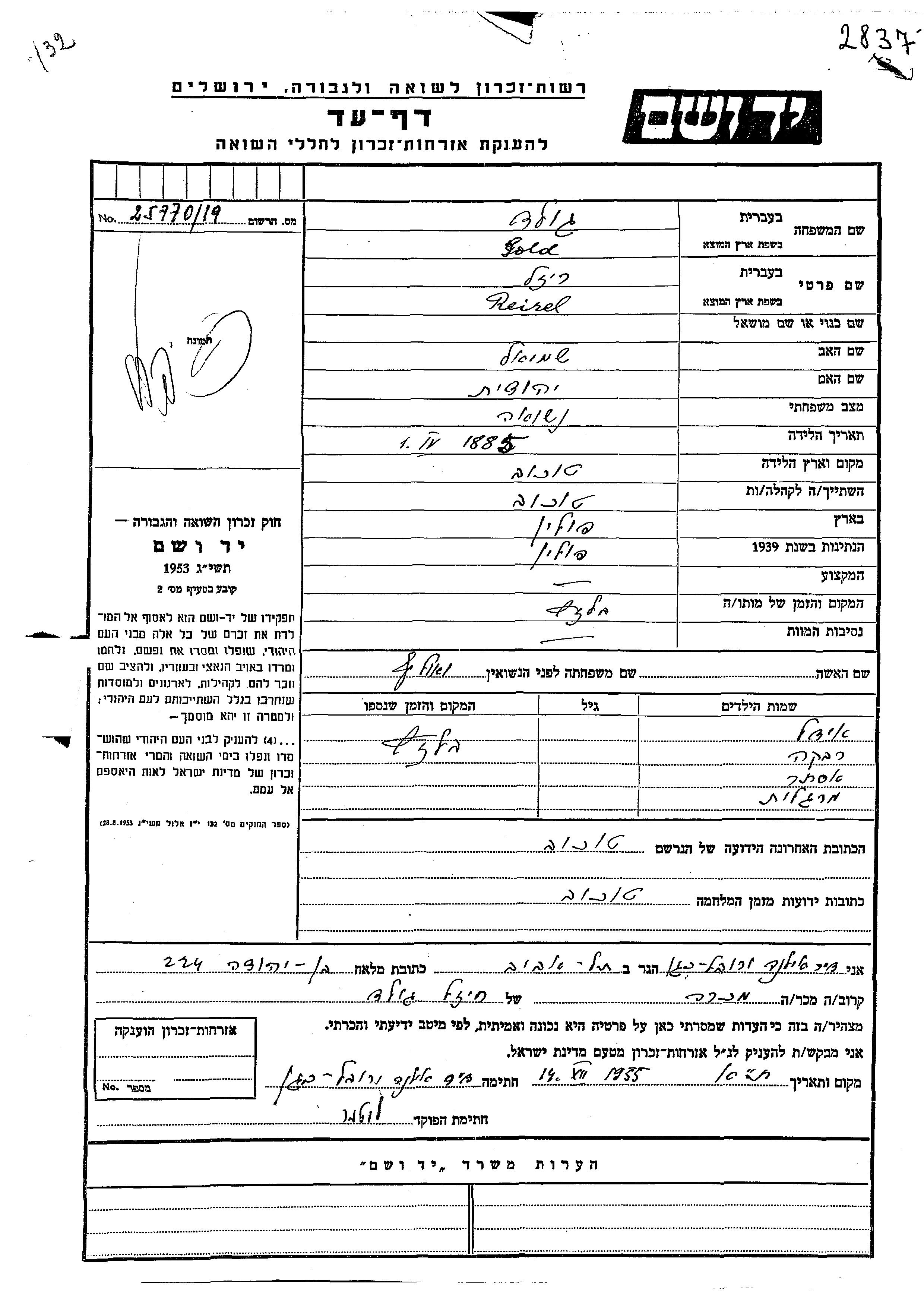 Idl Gold wurde Er/sie war der/ die Sohn/Tochter von Reizl, geb. Volf. Er/Sie war Kind. Vor dem Zweiten Weltkrieg er/sie in Tuchow, Polen. Während des Krieges war er/sie in Tuchow, Polen.