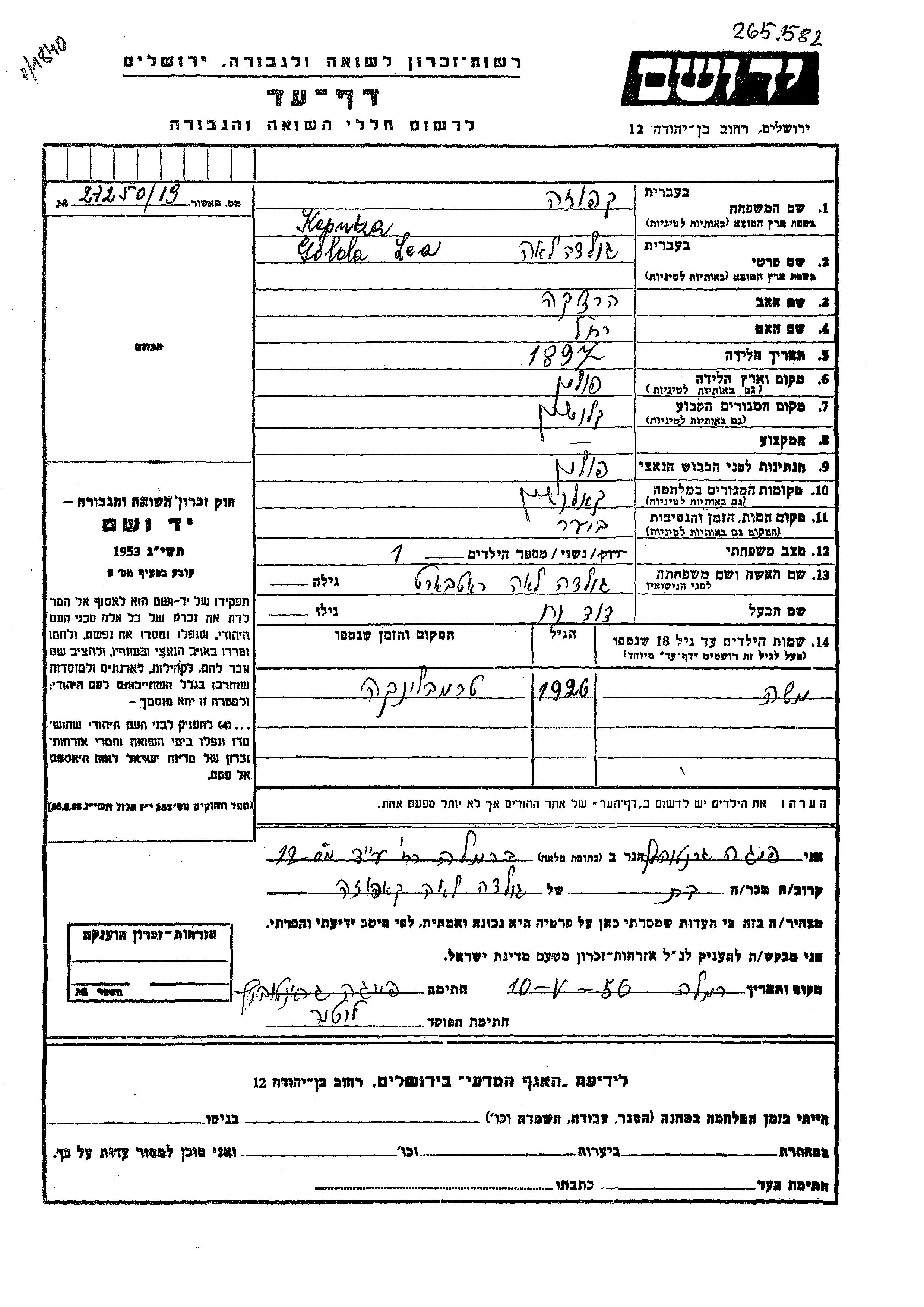 Yad Vashem - Gedenkblätter Sammlung