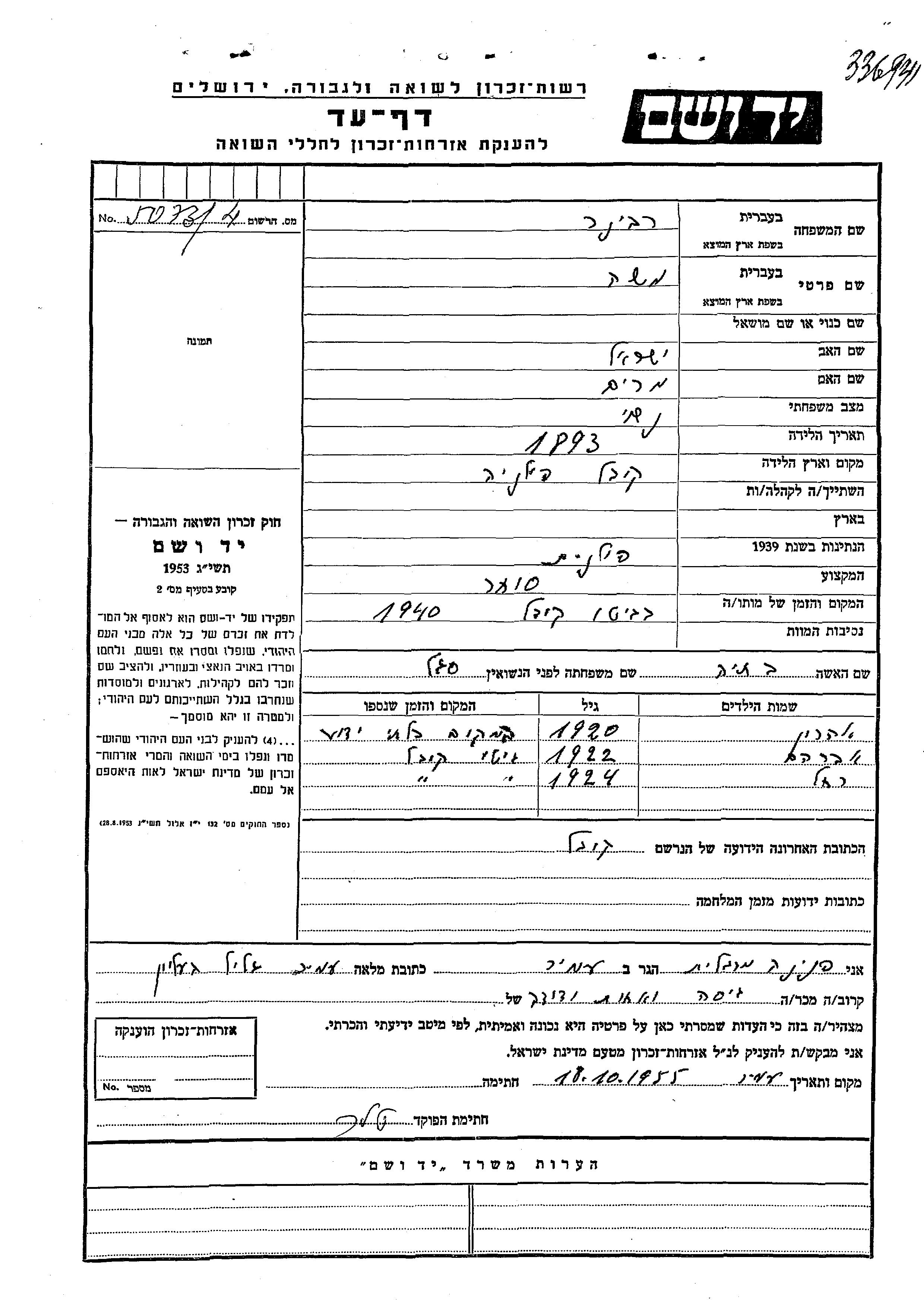 Rakhel Rabiner wurde im Jahr 1924 geboren. Sie war die Tochter von Moshe und Batia, geb. Segal. Sie war Kind. Während des Krieges war sie in Kowel, Polen.