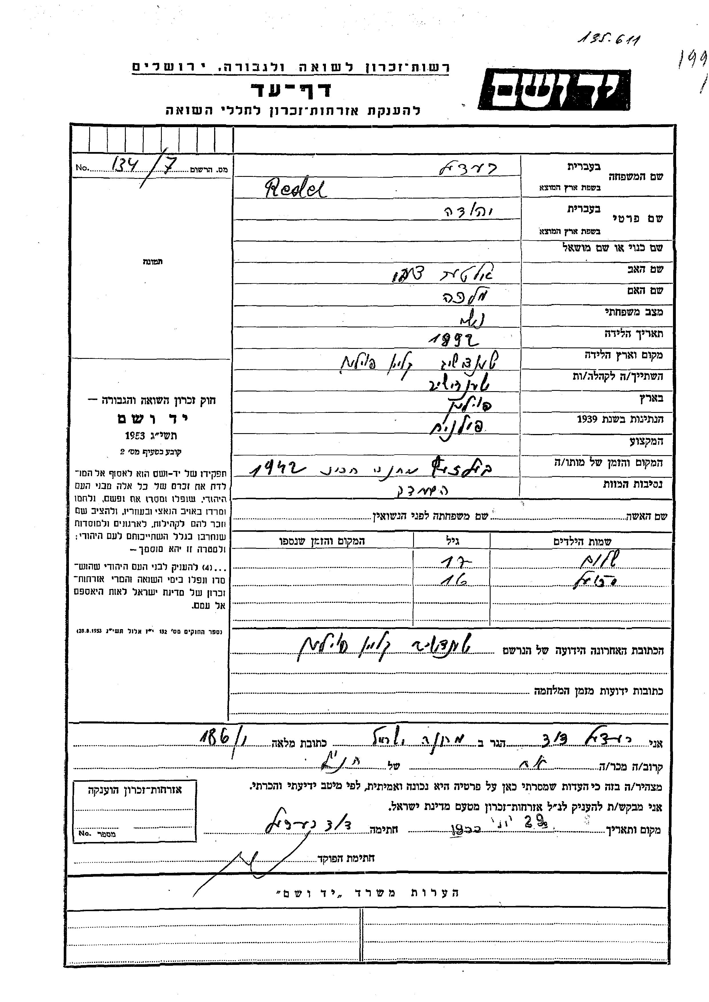 Vorname unbekannt Redil wurde Er/sie war der/ die Sohn/Tochter von Yehuda. Er/Sie war Kind. Vor dem Zweiten Weltkrieg er/sie in Sedziszow Maly, Polen. Während des Krieges war er/sie in Sedziszow Maly, Polen.