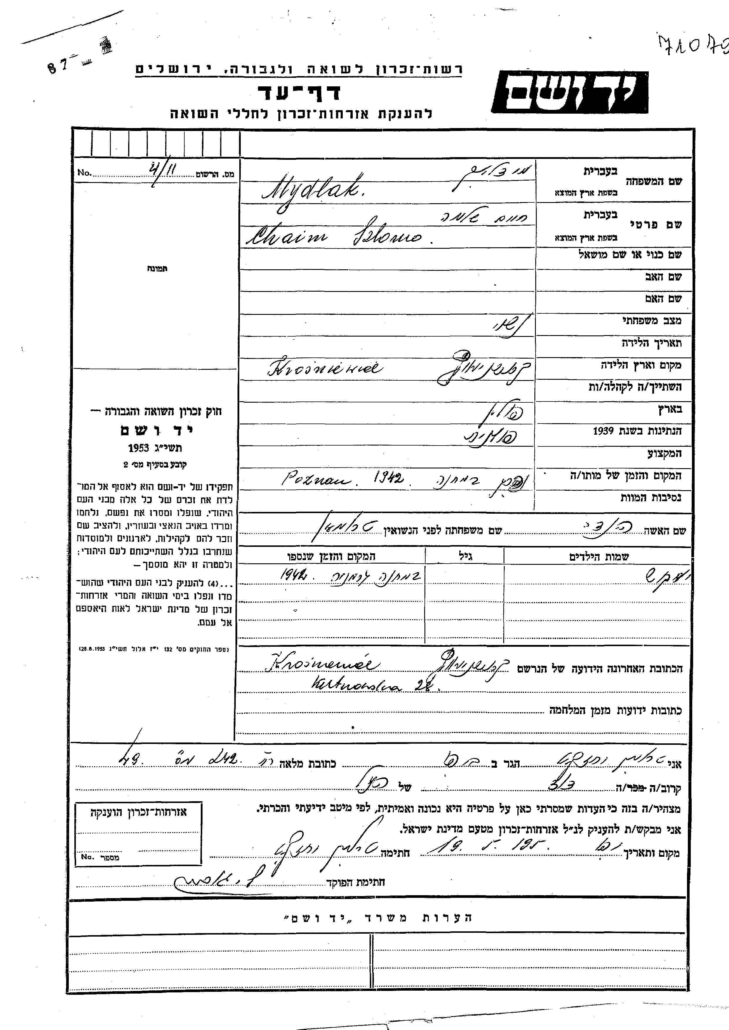 Yaakov Mydlak wurde Er war der Sohn von Chaim Szlomo und Hinda, geb. Troman. Er war Kind. Vor dem Zweiten Weltkrieg lebte er in Krosniewice, Polen.